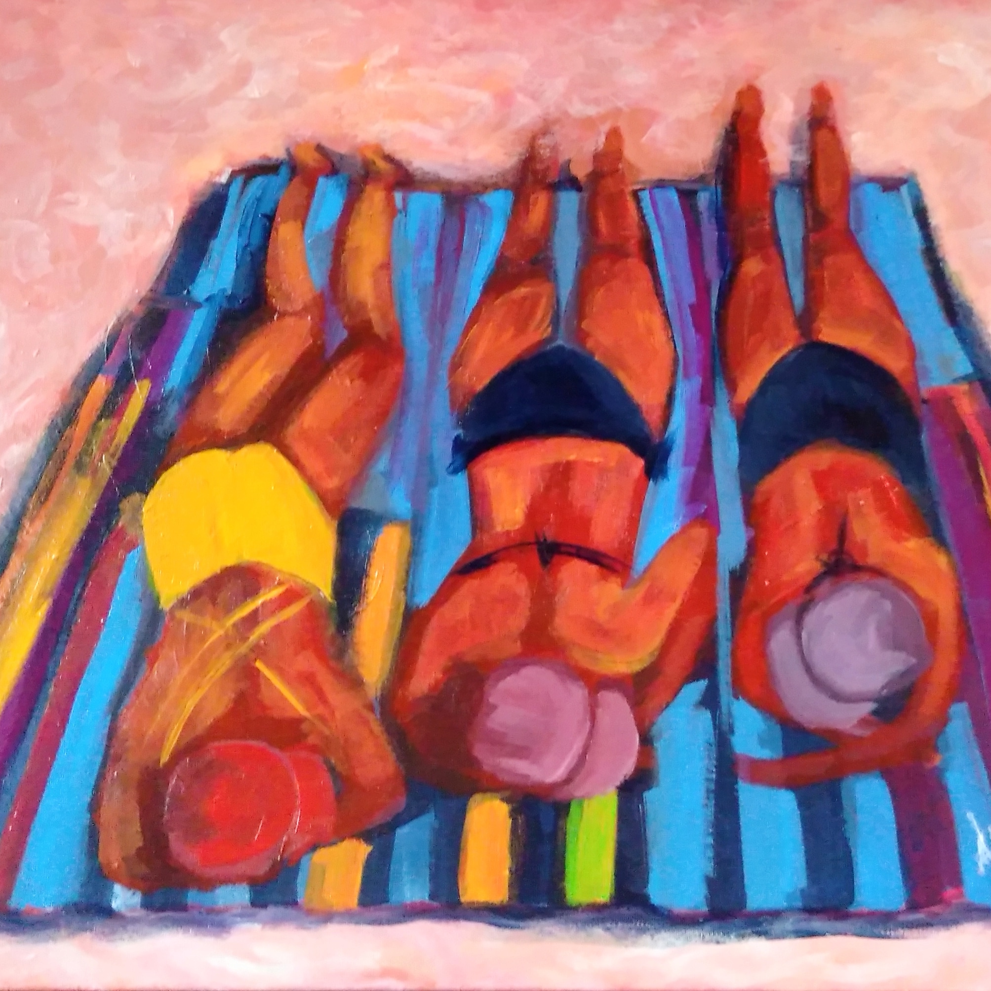 Girl talk by Angela Mulligan popart modern impressionist work inspired by my love of the beach.fun days out. Special moments when friends share their special secrets with each other. Girls just having fun .bold bright pops of colour to set the mood of the warmth of those sunny days at the beach. Will enhance any decor in your home or office.