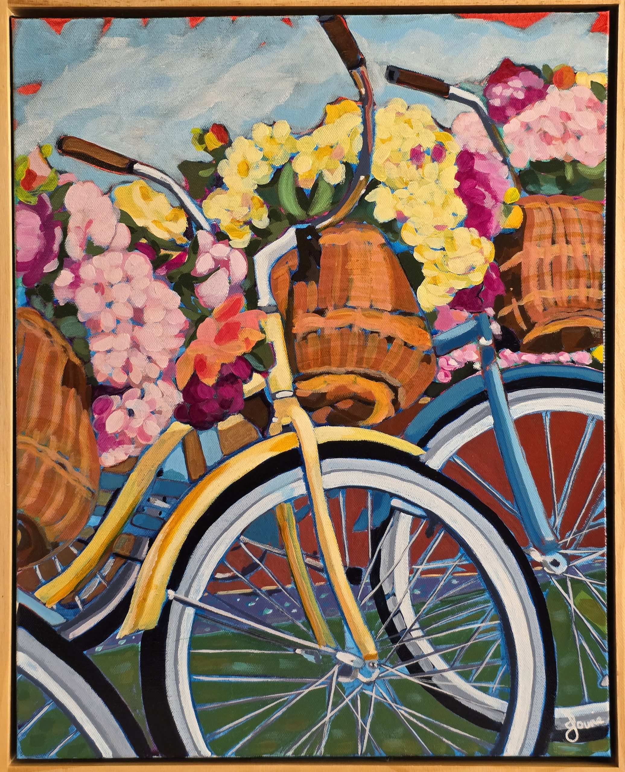 This is an acrylic painting on canvas. It is framed (wood frame) and ready to hang with d-hooks and wire. This artwork is sealed with a gloss varnish.