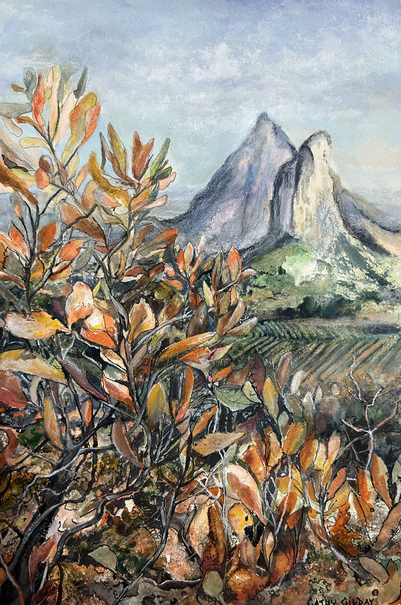 A view of Mt Ngungun – Glass House Mountains National Park, taken through rustic coloured foliage. I enjoyed creating this piece using a variety of mediums on a very heavy bodied watercolour paper. Requires framing. (The last two images are examples of the painting framed.)