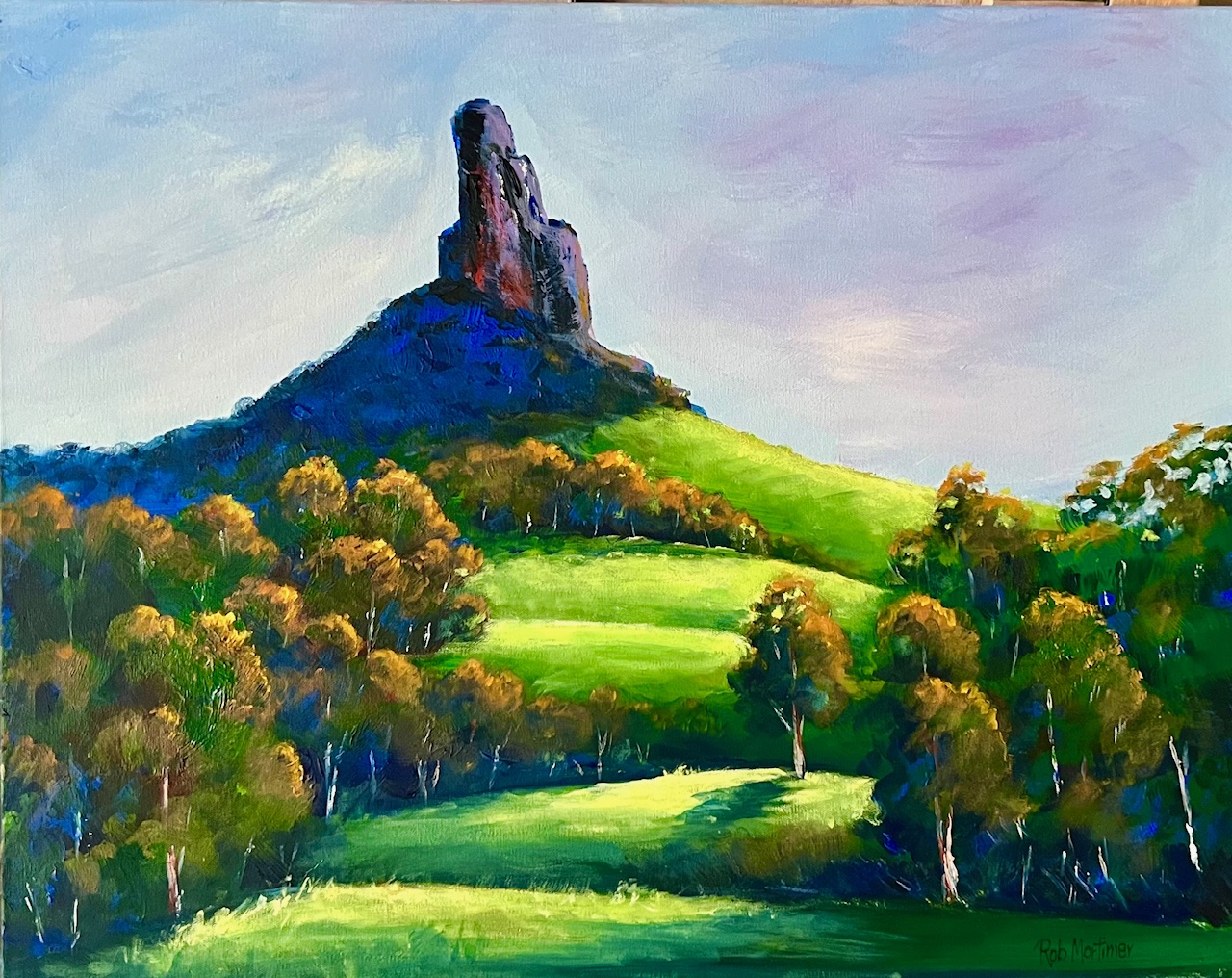 Original. Acrylic, on stretched canvas. The serenity of Mt Coonowrin the Glasshouse mountains QLD. Protective clear coats – Hooks and wire across back. on quality stretched canvas.