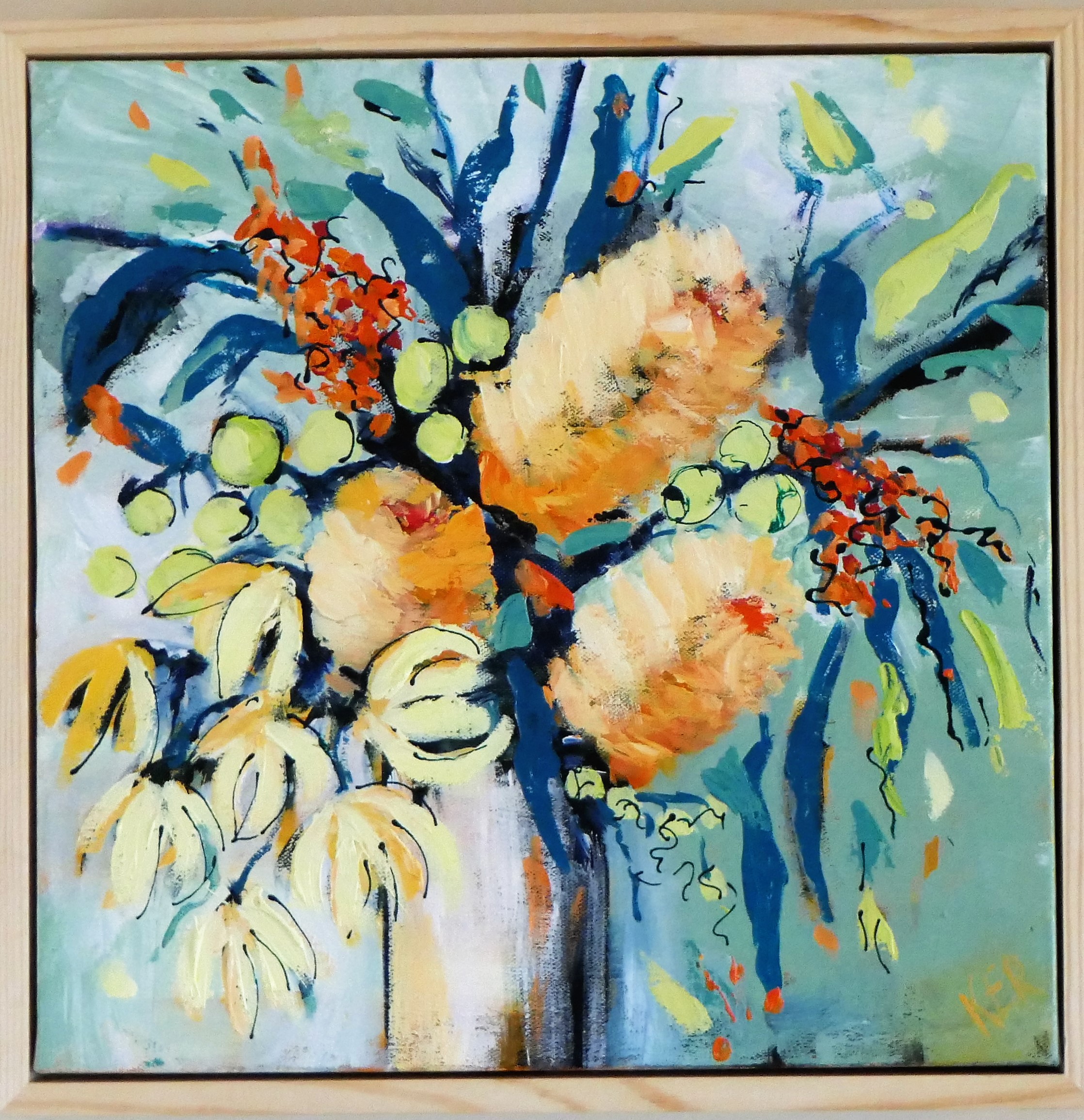 Glee by Karen Ritchie is a small, square format contemporary floral art work in mixed media (acrylic and ink) on deep sided stretched premium cotton duck, featuring a variety of Australian native florals against a light olive background. This work is framed and ready to hang. The frame is a satin sealed premium pine floater frame.