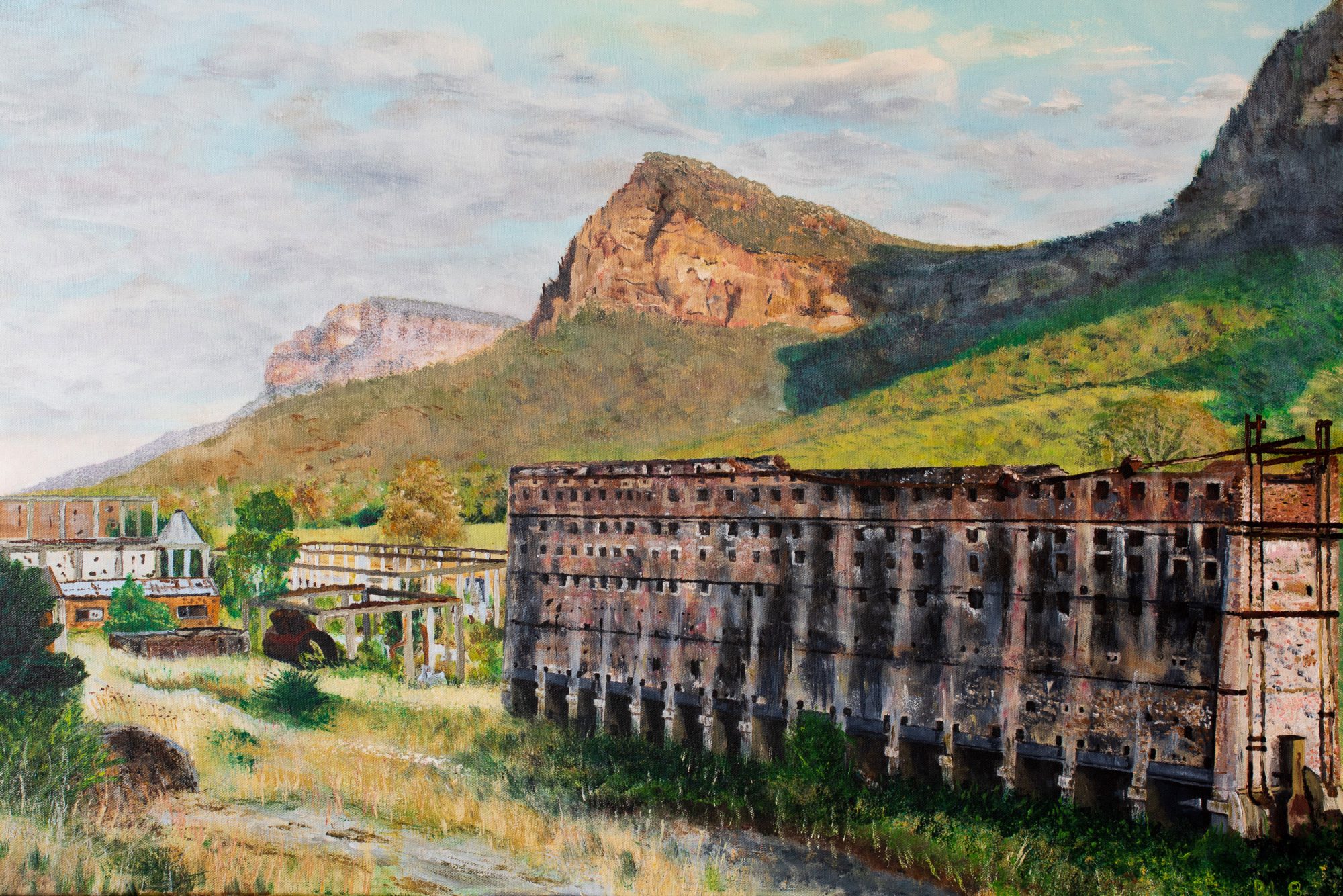 This painting draws inspiration from a photo I’d taken from the side of the Capertee Valley while looking towards the distillation plant (Retorts 1 and 2) with the Powerhouse in the background. In this artwork I like how the sandstone cliffs of the escarpment – with deep shadows – compliment the brickwork of the abandoned distillery.