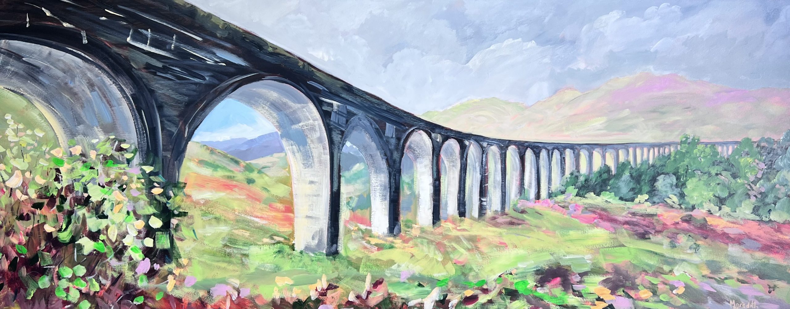 ‘Glenfinnan Viaduct’ by Meredith Howse is a vibrant, atmospheric, contemporary landscape designed to uplift any space with its intriguing colours and brush stroke energy.