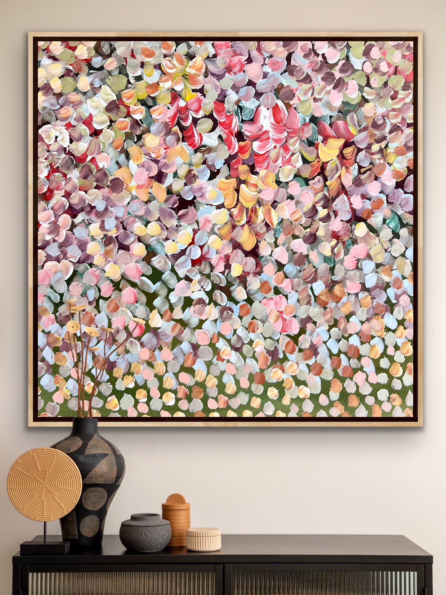 Is a painting with warm and cool colours of flowers and petals flying in the wind, creating a bouquet of petals over the landscape with lots of layers of acrylic paint. Petals weeping over the landscape creating so much movement and rhythms . A very peaceful and tranquil painting with so much depth.