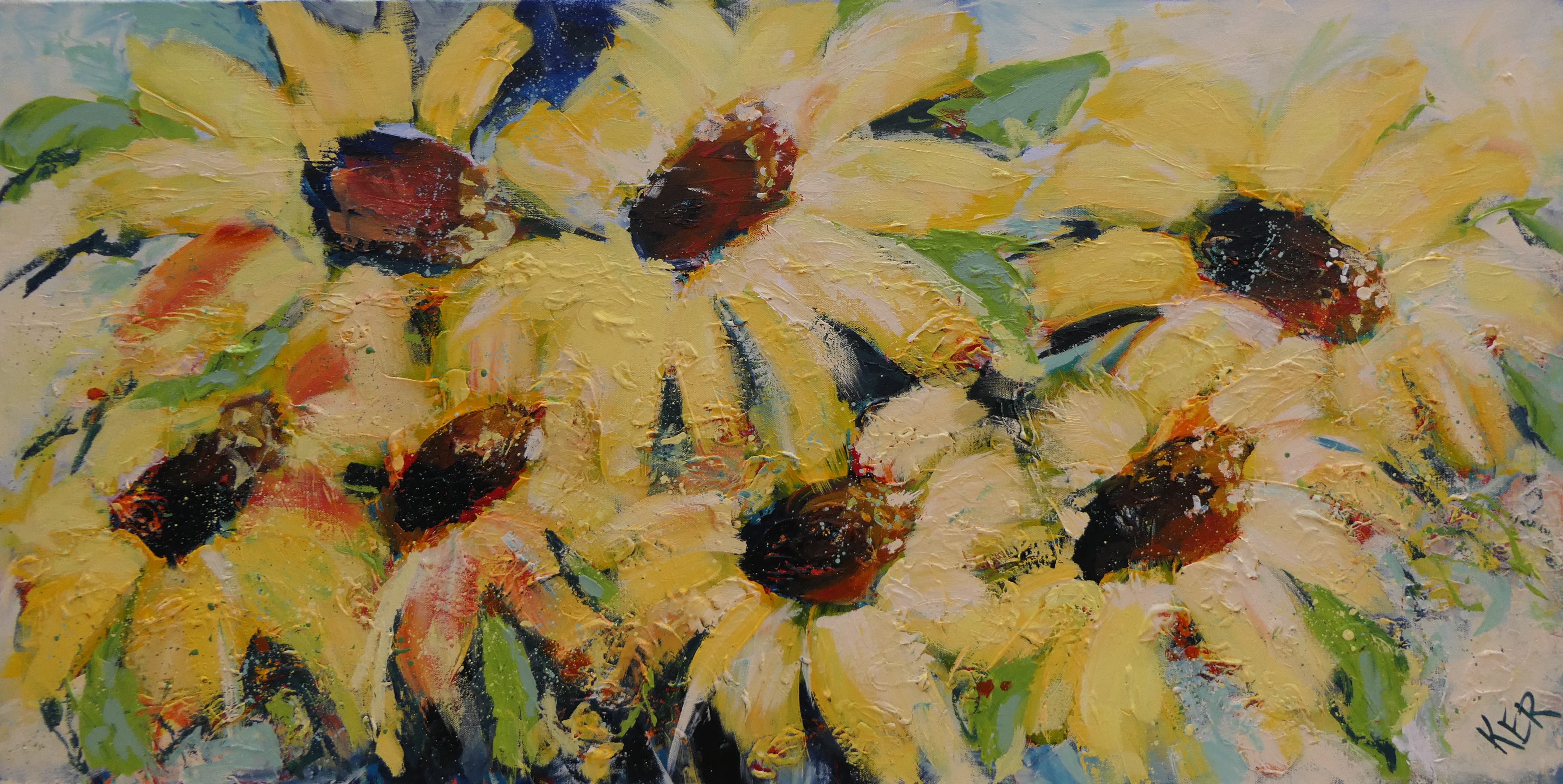 Glorious Sunshine is a large, rectangular format, expressive botanical artwork in acrylic on deep sided artist quality, stretched cotton duck. This painting features large yellow sunflowers against a cream and pale blue background. This work is unframed but ready to hang. The canvas sides are clean and raw.