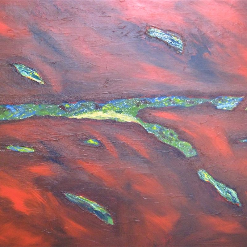 The artwork has been given an isolation coat followed by a gloss varnish. It is in an unpainted, wooden, floating frame.