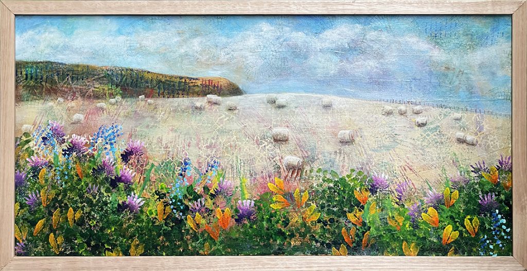 One of my favourite pieces. For some unknown reason, I love those ‘sausage roll’ type hay bales. I also loved doing that hedgerow with the flowers.
