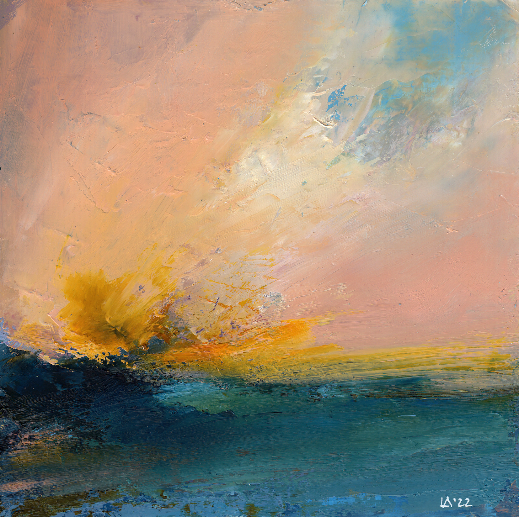 Glow 3 by Lamice Ali –Â The sea will always be an inspiration, so it’s no surprise that I always return to this subject. I decided to work on a collection that was more impressionistic than semi-abstract, thus the addition of a clear sun and horizon. The focus here is very much on palette and movement, which is why the majority of the paint has been added using a palette knife.