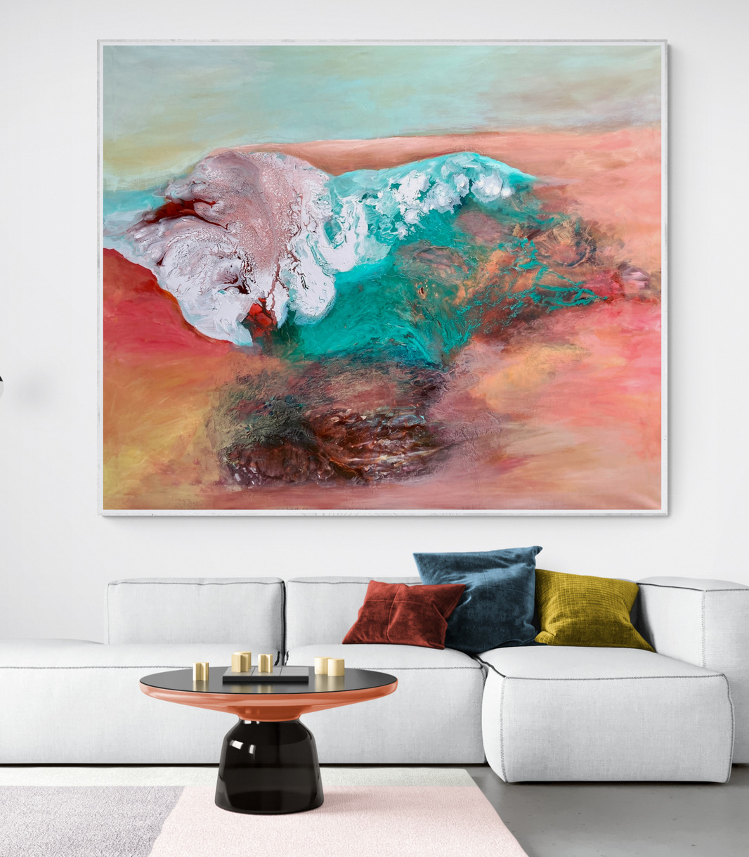 Glowing Land by Theo Papathomas an abstract painting celebrating colours of the landscape and light. A very soothing and tranquil painting where sky, clouds, water , snow come together to create this beautiful harmonious landscape. Capturing the beautiful warm and cool colours of the landscape against the light colours of the sky. A hill covered in snow with so much texture is the main attraction in the painting .Painted in a very expressionistic way with acrylic paints and lots of texture with lots of layers of paint , to create so much depth in the painting .A very harmonious composition of colours and forms that makes it a very poetic and romantic painting .The painting does not come with an external frame.The painting is signed and dated 2022 at the back and comes with a certificate of Authenticity.