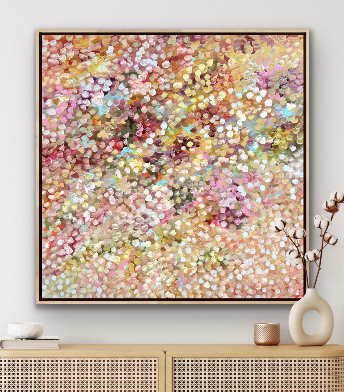 Glowing Love by Theo Papathomas is a painting with warm and cool colours of petals flying in the wind creating this beautiful carpet of petals over the landscape with lots of layers of acrylic paint. Petals weeping over the landscape creating so much movement and rhythms . A very peaceful and tranquil painting with so much depth. The painting does not come with an external frame.The painting is signed and dated at the back and comes with a certificate of Authenticity.