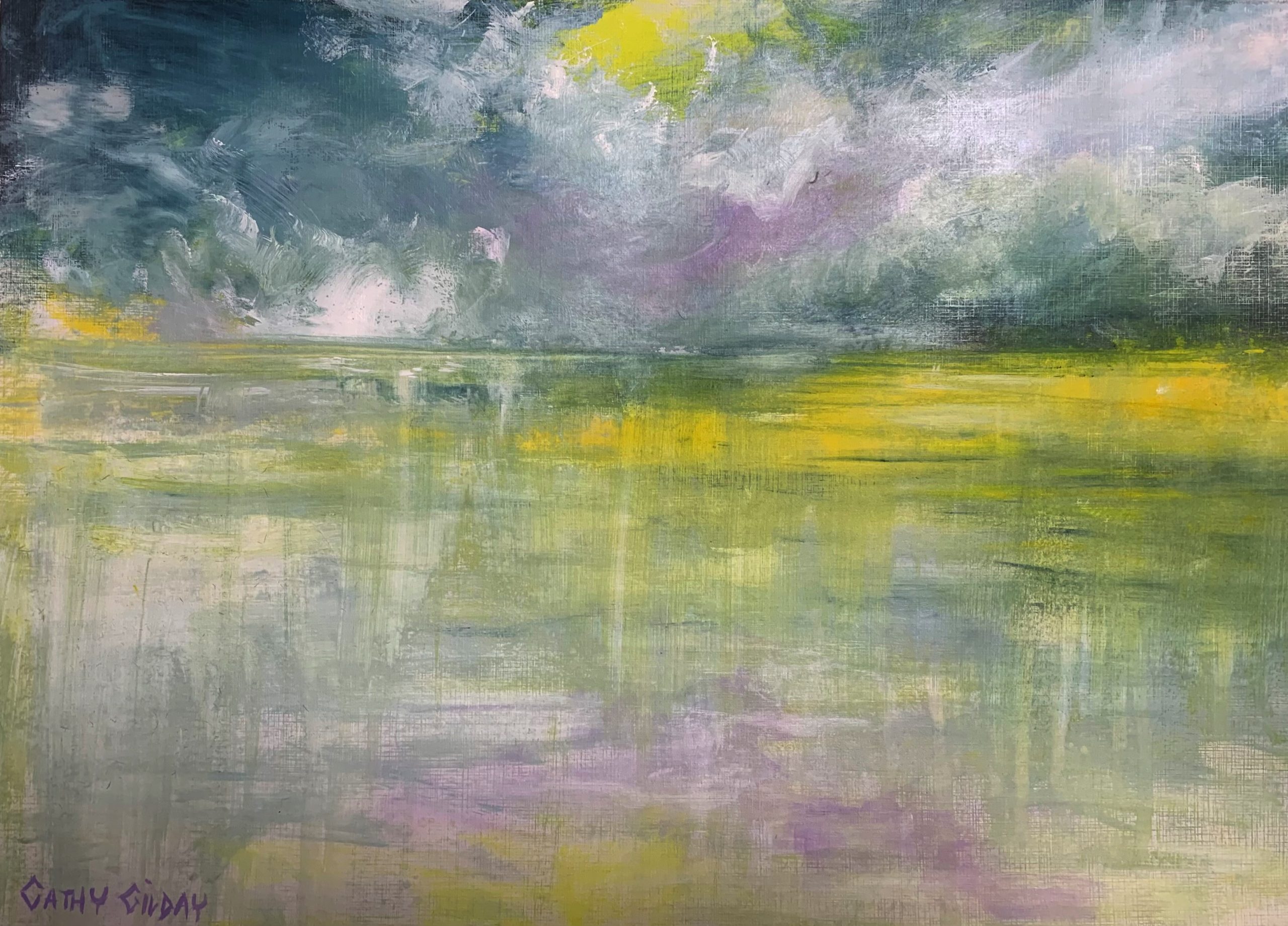 Glowing by Cathy Gilday – An impressionistic painting capturing the beauty of nature. In this piece, the glowing golden sky reflects as if skipping across the water. Signed front and back.