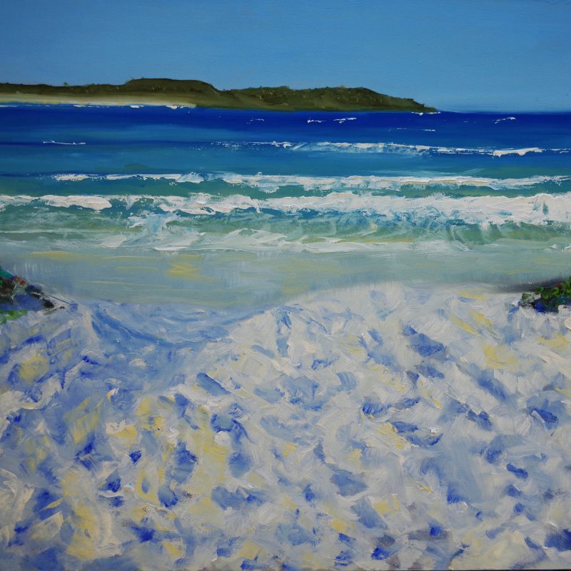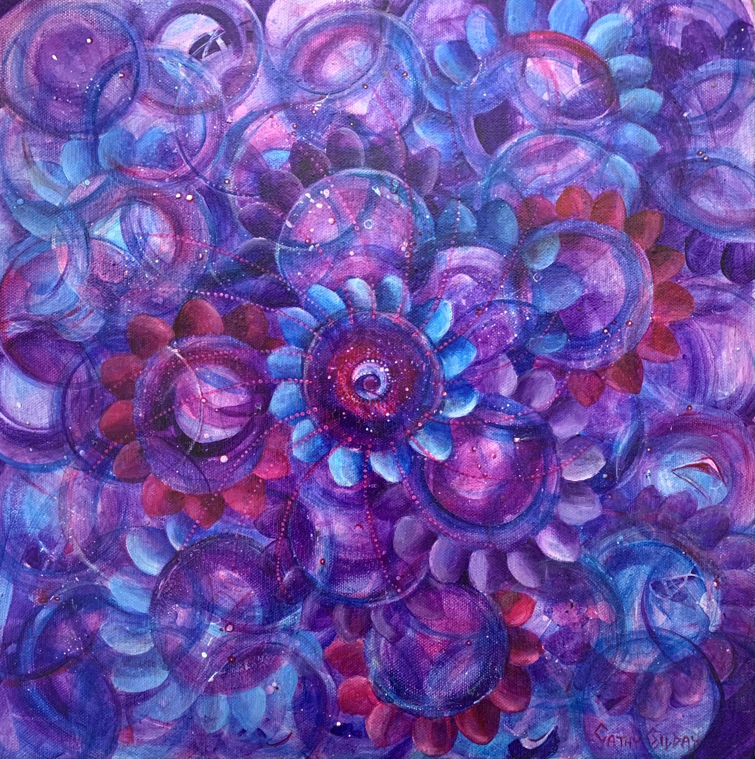 Going Round Blue by Cathy Gilday – I found this continuous geometric pattern of blue circles with purple and blue glazes, was such a pleasure to create that it almost felt meditative. With a mandala-like form, this painting has a feeling of calmness and tranquility. It has a central focus that tends to have the viewer following in a circular motion.