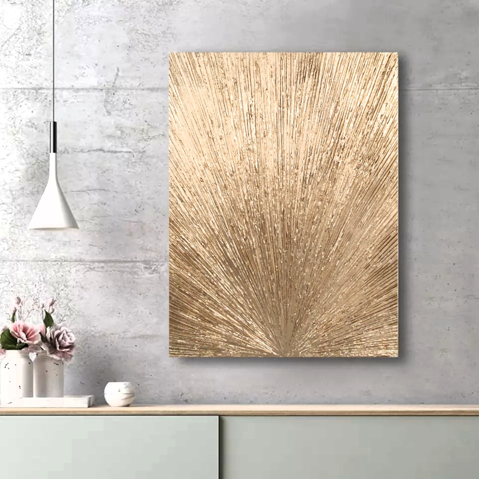 This piece is made by layering modeling paste on canvas in a straight patten and spray painted with high quality metallic gold spray paint. This create the unique 3D design.