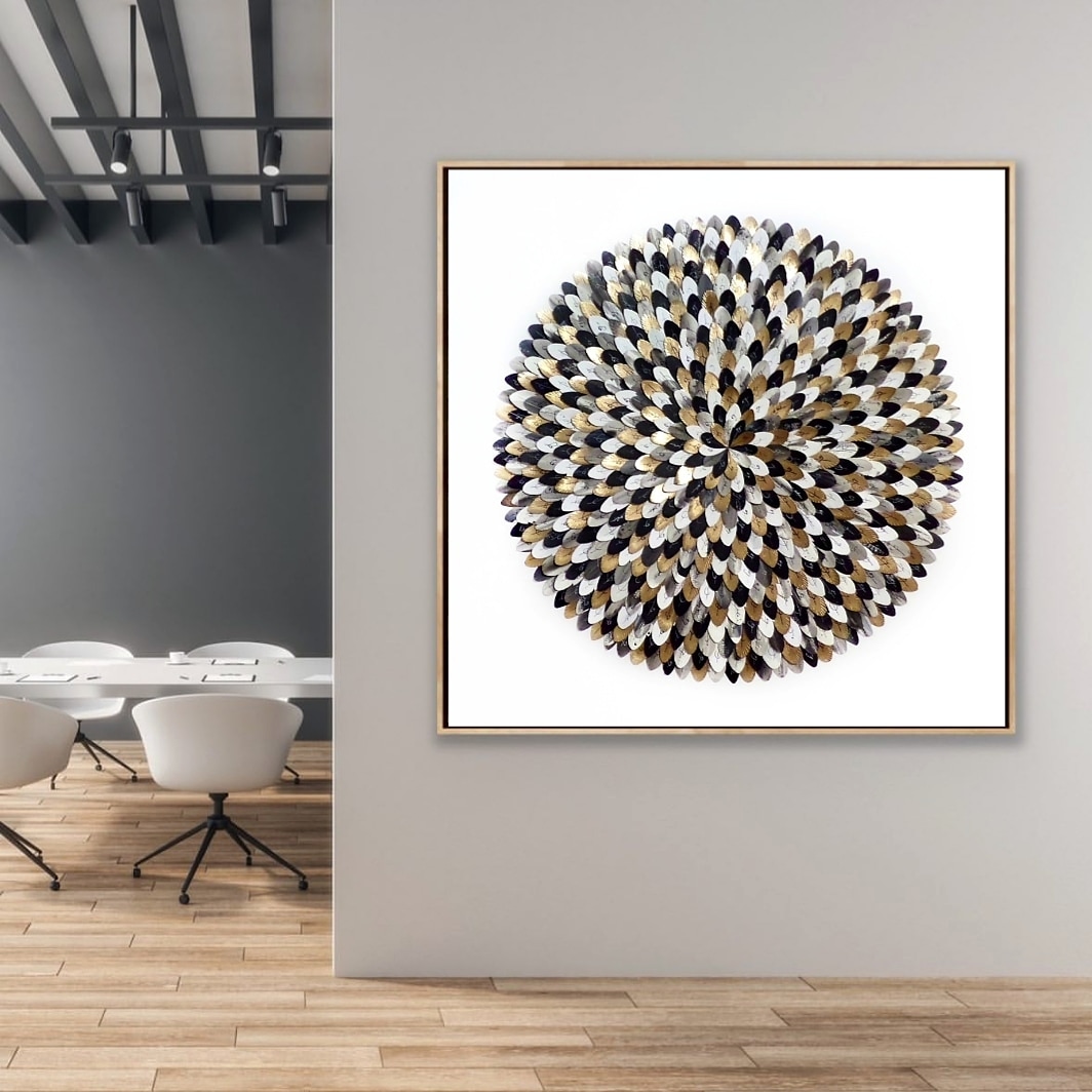This “Gold Finch”, compromising gold,white,grey and black colours on a brilliant white background with a natural wood box style frame makes this piece a beautiful modern contemporary piece of art which fit’s easily into any interior style.