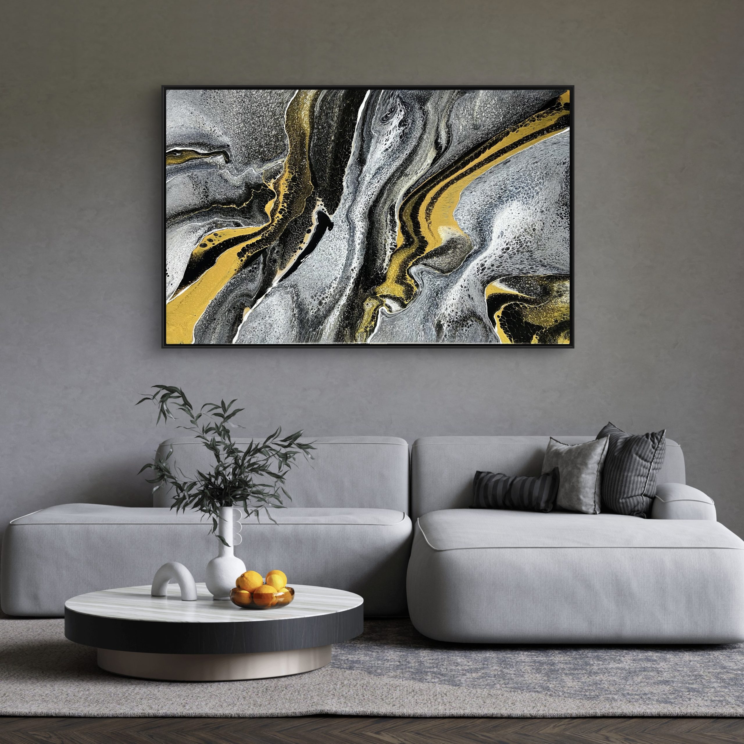 This beautiful piece is 160cm x 100cm and features black, grey, paynes grey, silver, metallic gold and white acrylics. I will sign the bottom left corner once the orientation is confirmed as this painting can be hung multiple ways.