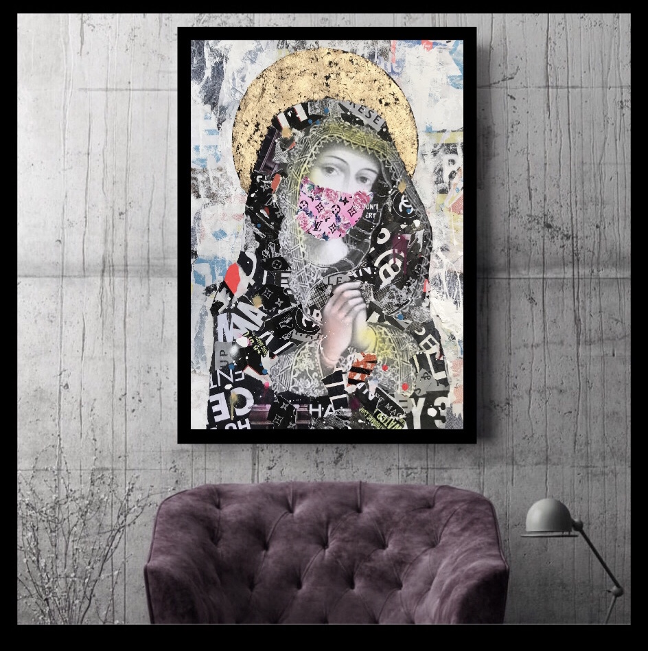The main vintage icon was added, then overlaid further with paint and paper to give a worn rustic appearance & topped off with the most essential fashion accessory in the modern world, a face mask.