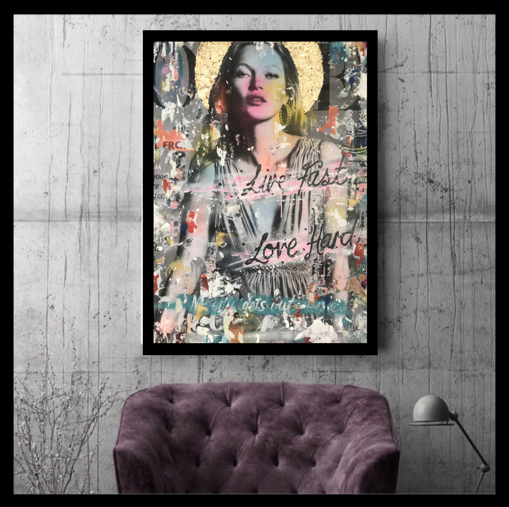 The main vintage image of Kate Moss was added, then overlaid further with paint and paper to give a worn rustic appearance & finished off with a Gold Leaf halo.
