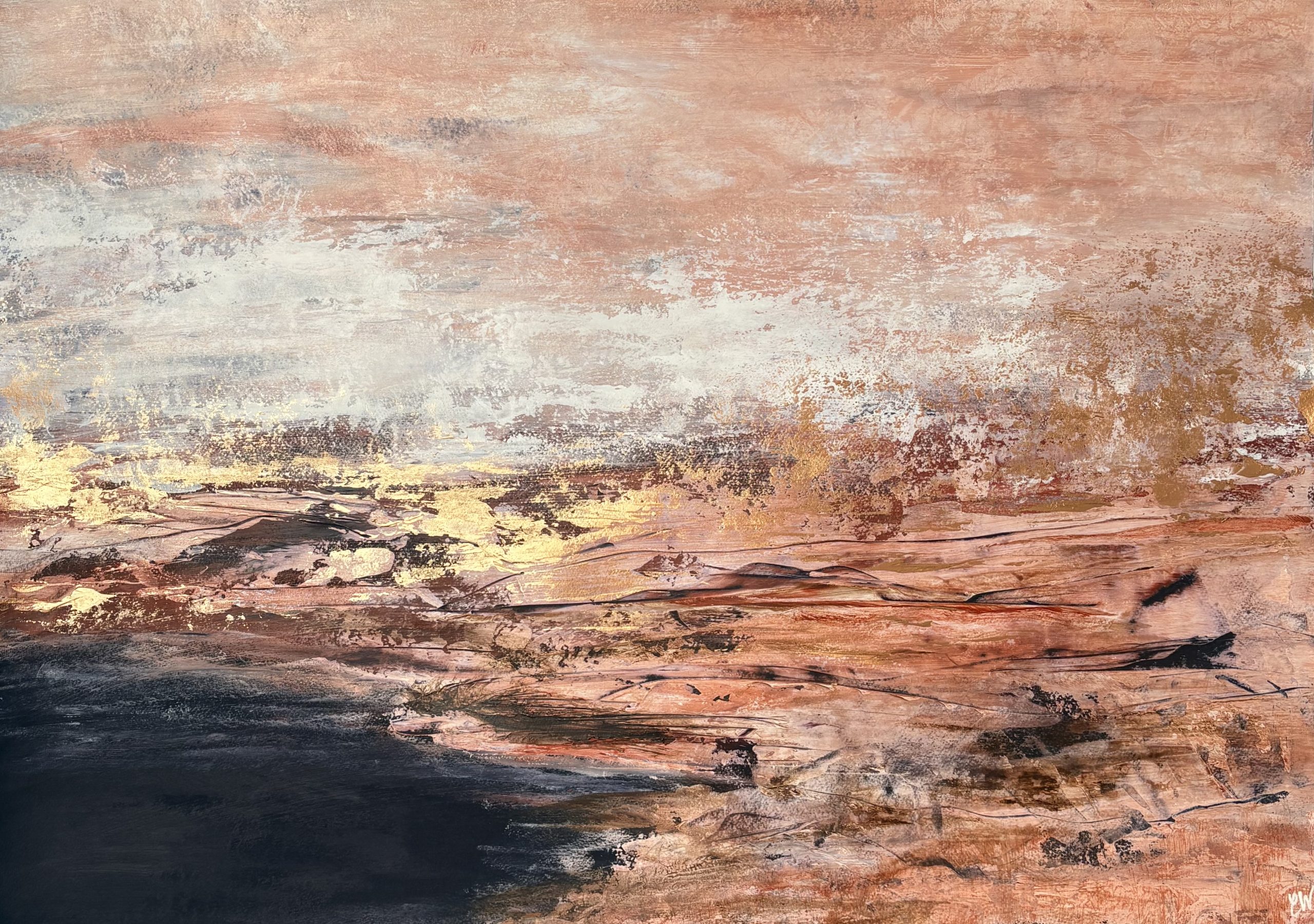 A beautiful abstract landscape/seascape with shimmering gold details.