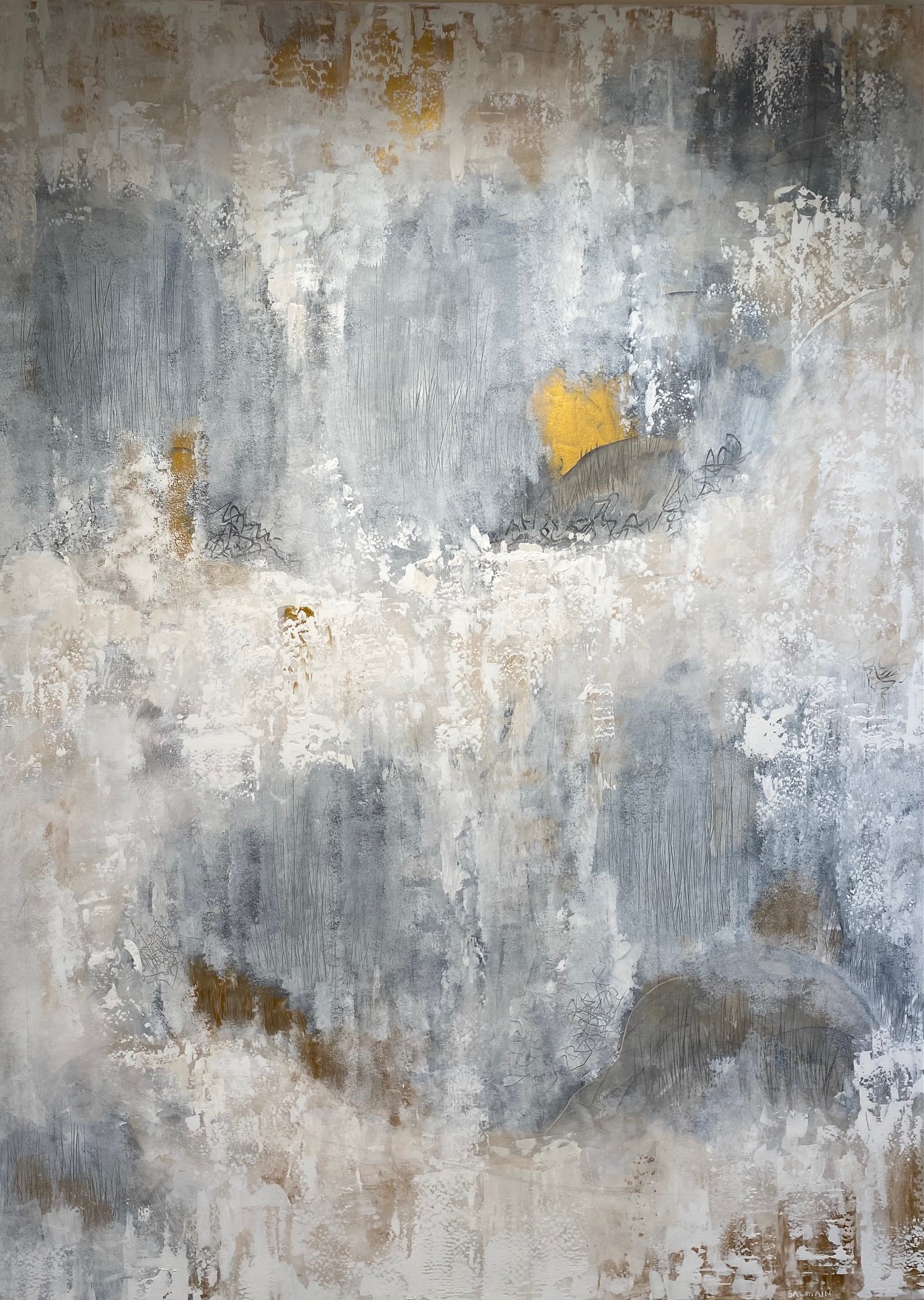 A large deconstructed landscape in portrait that extends from ceiling to floor creating a doorway portal in a room. Light earth tones with seams of gold emanating from the earth that create precious highlights.