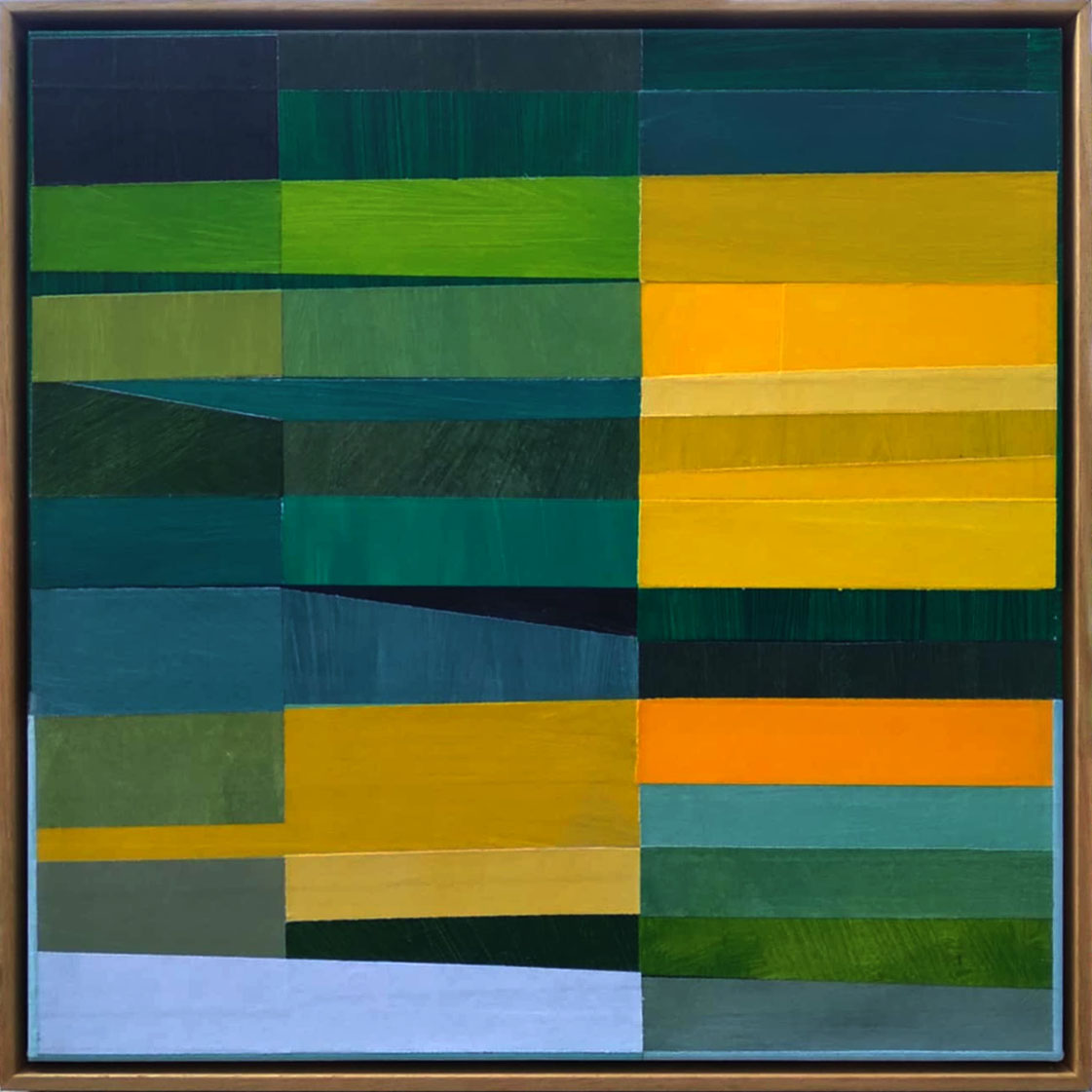 Golden Fields of Green – abstract landscape by Bozena Wiszniewski – this vibrant piece invites you to explore a harmonious blend of greens and yellows, layered in a way that creates a sense of depth and movement. Each rectangular segment tells its own story, while collectively they form a captivating tapestry that evokes the beauty of nature. The interplay of colors, from deep emerald to sunny gold, brings a refreshing energy to any space.