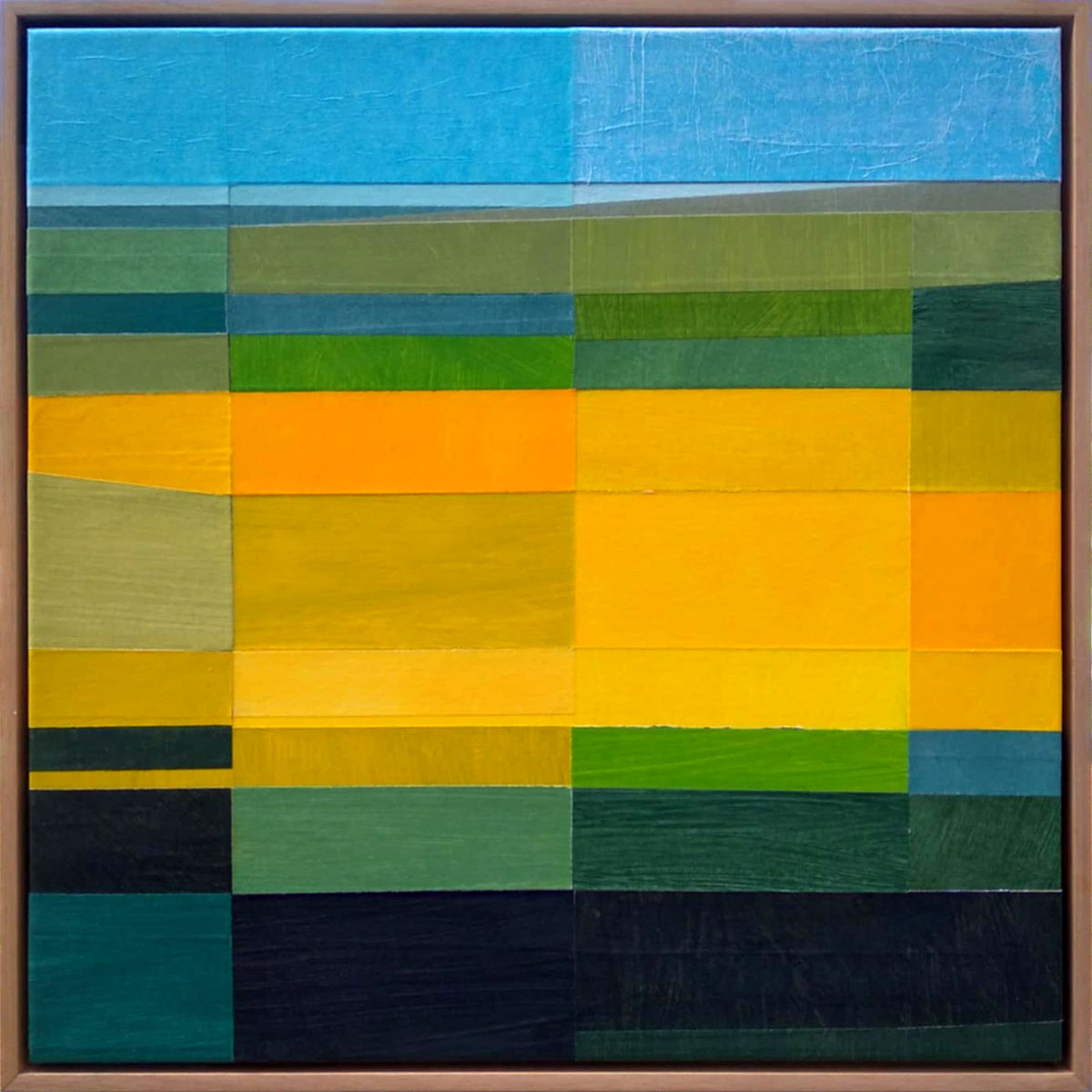 Golden Fields Under Blue Skies – abstract landscape by Bozena Wiszniewski – this vibrant abstract artwork presents a captivating landscape of geometric shapes and rich colors. The interplay of blues, greens, yellows, and deep blacks creates a dynamic visual experience, inviting viewers to explore the layers and textures within. Each section reveals a unique harmony, evoking the essence of nature while maintaining a modern aesthetic. The artist’s playful approach to color and form encourages a sense of joy and curiosity, making it a delightful addition to any space.