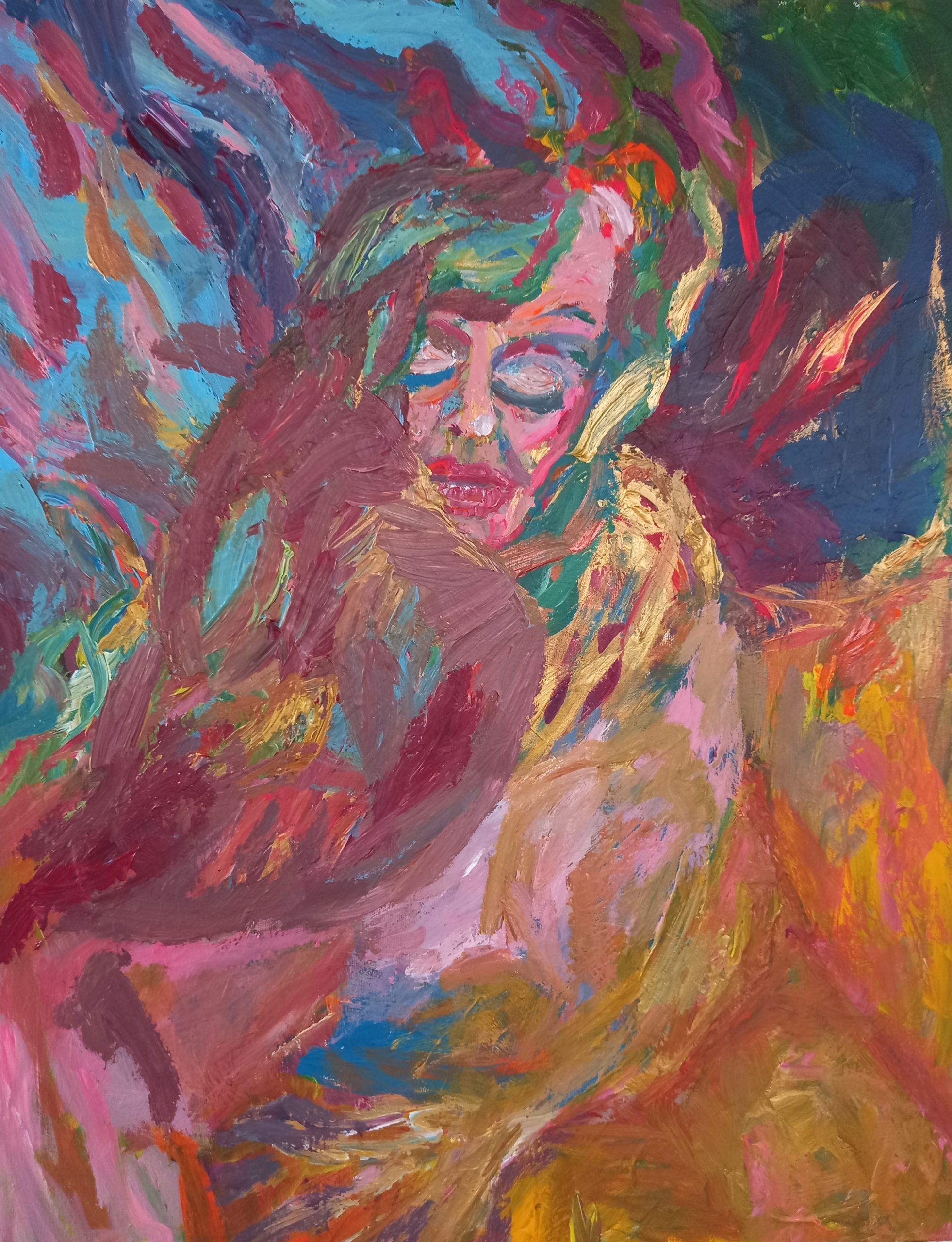 This piece celebrates the strength of women and female sensuality, wrapped up in the beautiful golden glow of Autumn; the season of renewal. “I was thinking of how early Celtic cultures really celebrated the changes of the seasons, and the feminine was valued. I was influenced by the novel ‘Forever Amber’ which centres around a beautiful, ambitious woman in 17th century England. In what was definitely a man’s world, she was sensual and seductive and a survivor. Nobody’s fool.” says Andrade. This is a celebration of the strength of the feminine. with Autumn overtones. It has flecks of gold paint on it that shine under certain lighting and is attractive in colouring.
