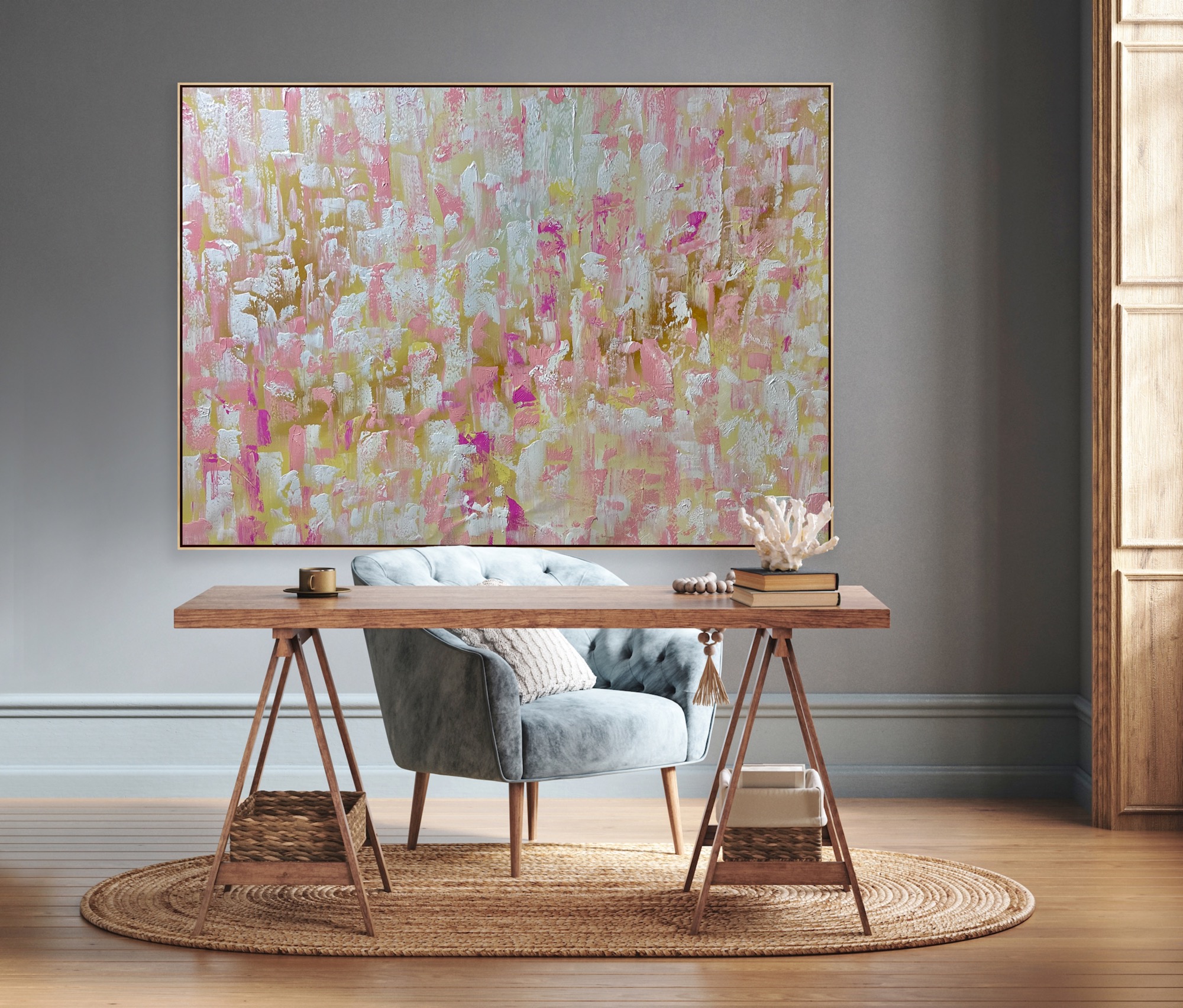 This radiant abstract from the Weathered Series invites the viewer into a world where warmth and joy radiate like the final light of day on a peaceful coastline. With layers of delicate blush pink, soft white and sun-kissed gold, this textured painting captures the uplifting spirit of a carefree beachside afternoon. The palette feels like sunlight on skin, laughter carried on the breeze, and the comforting presence of nature’s quiet magic. Its grounding texture encourages stillness while the luminous tones speak to optimism and inner peace.
