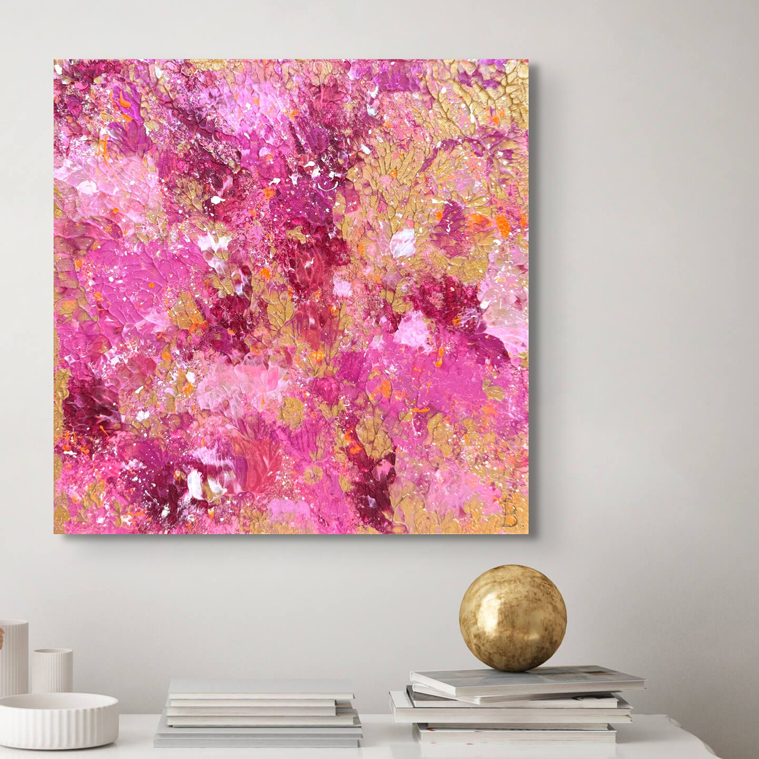 The artwork has loads of texture, features pastel pink blooms, rich magenta with  metallic gold accents, and delicate marks in bright orange and white indicating petals. The canvas edges are painted in metallic gold, adding a touch of elegance. While offered without an external frame, the golden edges give the work a luxe look. if you prefer a frame, I suggest it  would look equally stunning framed in either a custom-made gold frame or Tasmanian Oak float frame.