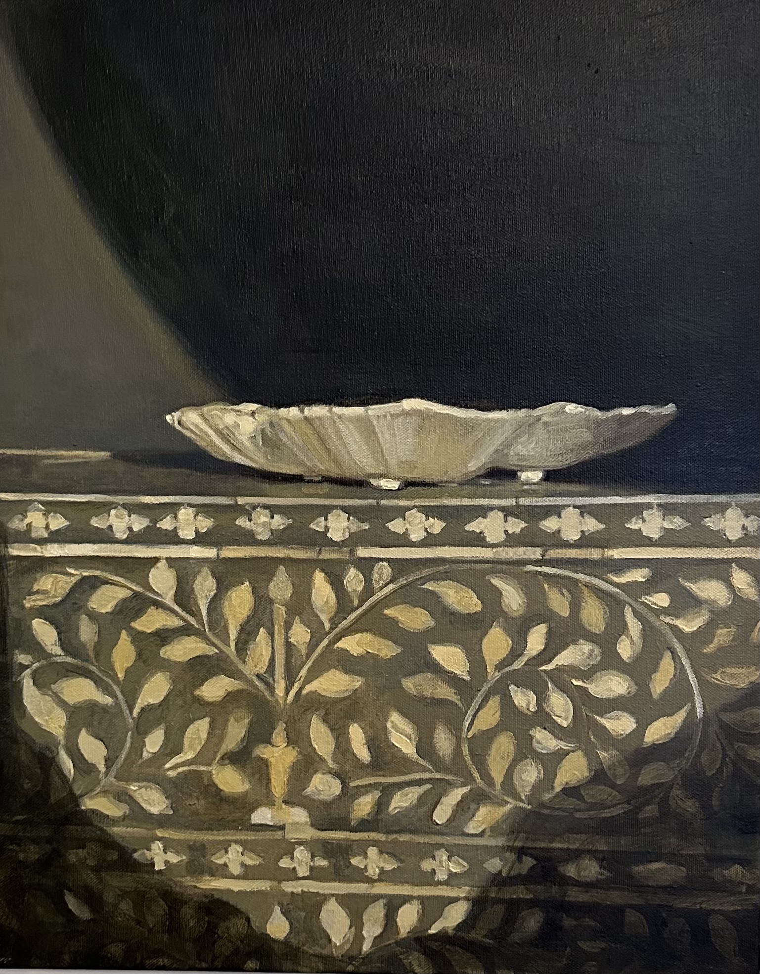 I have always been interested in atmospheric qualities of fleeting light at different times throughout the day. This is a painting of a vintage shell dish in the golden light that poured in my window one afternoon. It is placed on a vintage inlay dresser half in shadow. I always notice the colour of light in different places. It’s rare to see such intense light in this golden colour in Sydney. I attempted to recreate the glow using layers of thin highly saturated paint.
