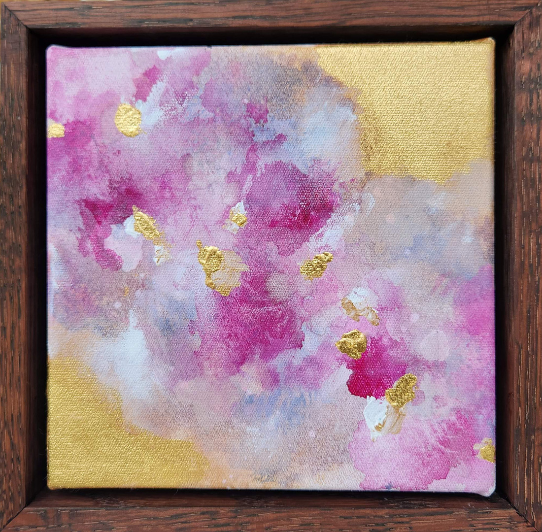 ‘Golden roses’Â by Fern Siebler is a love filled mini artwork featuring dreamy tones of pink and 24k gold leaf as well as metallic gold acrylic paints.