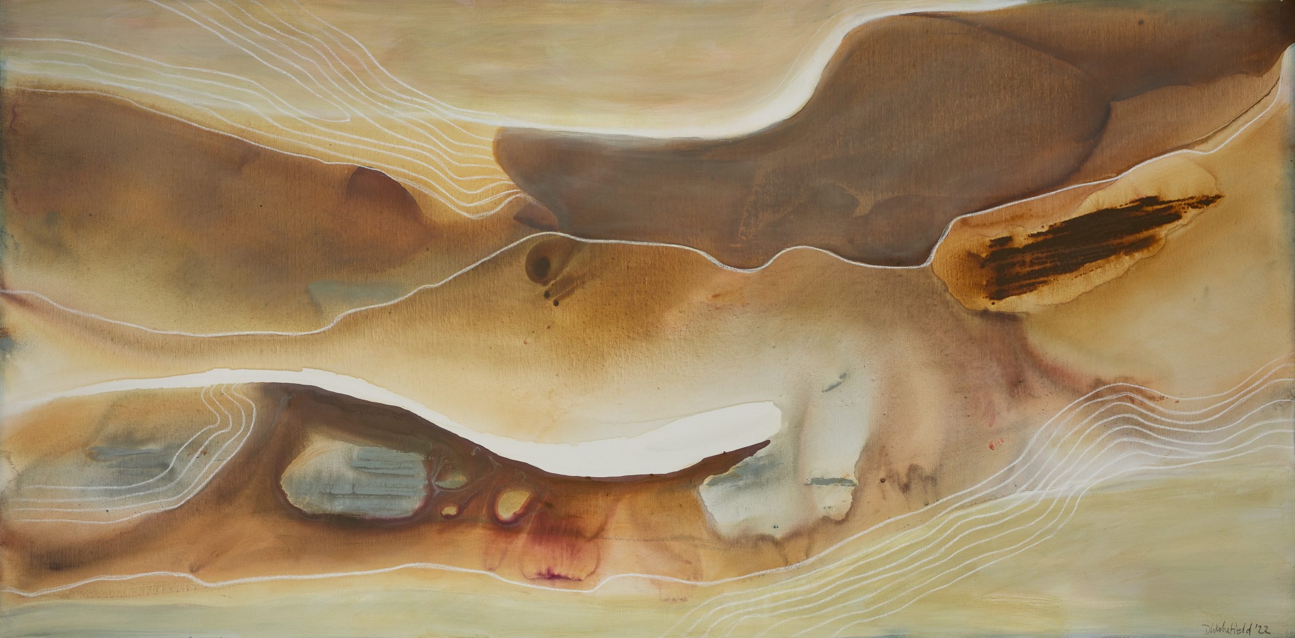 Golden Sands by Dinah Wakefield is inspired by the light, the colours and the natural beauty of the Noosa region of Australia. “What I love most about Noosa is the interplay of light. From the oceans to the clouds, to the river estuaries and the hinterland, this canvas unfolds before me every day and finds expression in my paintings”.