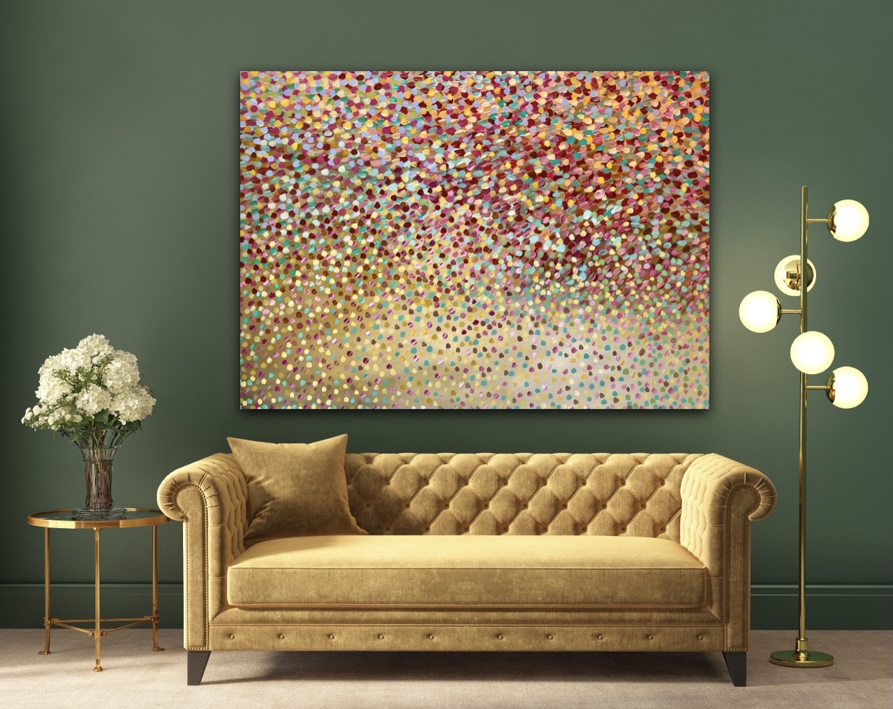 A beautiful bouquet of petals in the sky weeping onto the landscape with a golden sky in the background with so much depth that invites the viewer to be part of the painting. The light of the sun in the background shining on to the petals makes the whole painting feel very warm and happy. Fireworks of petals light the whole sky like musical notes dancing to their own rhythms creating a beautiful colourful rainbow bouquet . Hope with this work it makes the viewer feel very peaceful and tranquil. I tried to create so much depth in the painting with a beautiful sunset colours in the sky . The painting is signed and dated 2022 at the back and comes with a certificate of Authenticity.