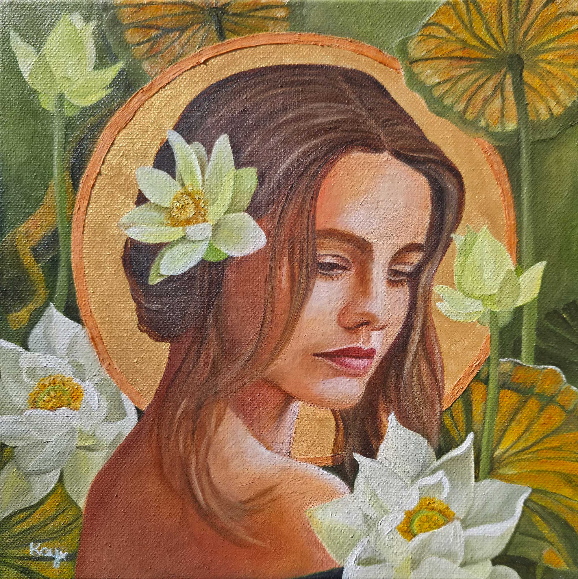 A quiet moment of introspection, Golden Stillness portrays a woman surrounded by lotus blooms—symbols of resilience and renewal. The golden halo behind her, inspired by the graceful lines of the Art Nouveau era, elevates her presence to something sacred and timeless. This piece reflects my ongoing exploration of feminine strength, beauty, and the natural world.