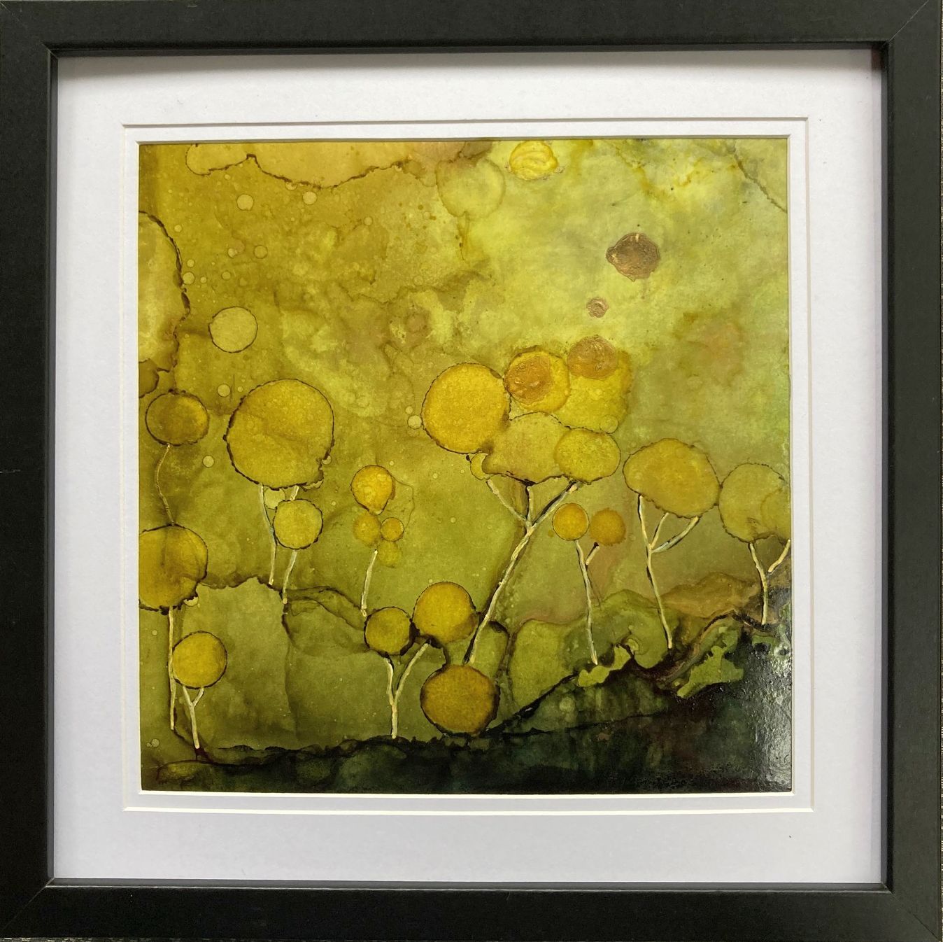 ‘Golden Times’ by Marta Blaszak – is an Alcohol Ink painting on 22cm x 22cm Yupo Paper. It is framed with a black 28cm x 28cm frame with a white mat behind glass. A hanging wire is attached to the back so it can be hung immediately. Art Lovers also offers a professional Framing Service if desired. The Hoverlay image shows the supplied frame.