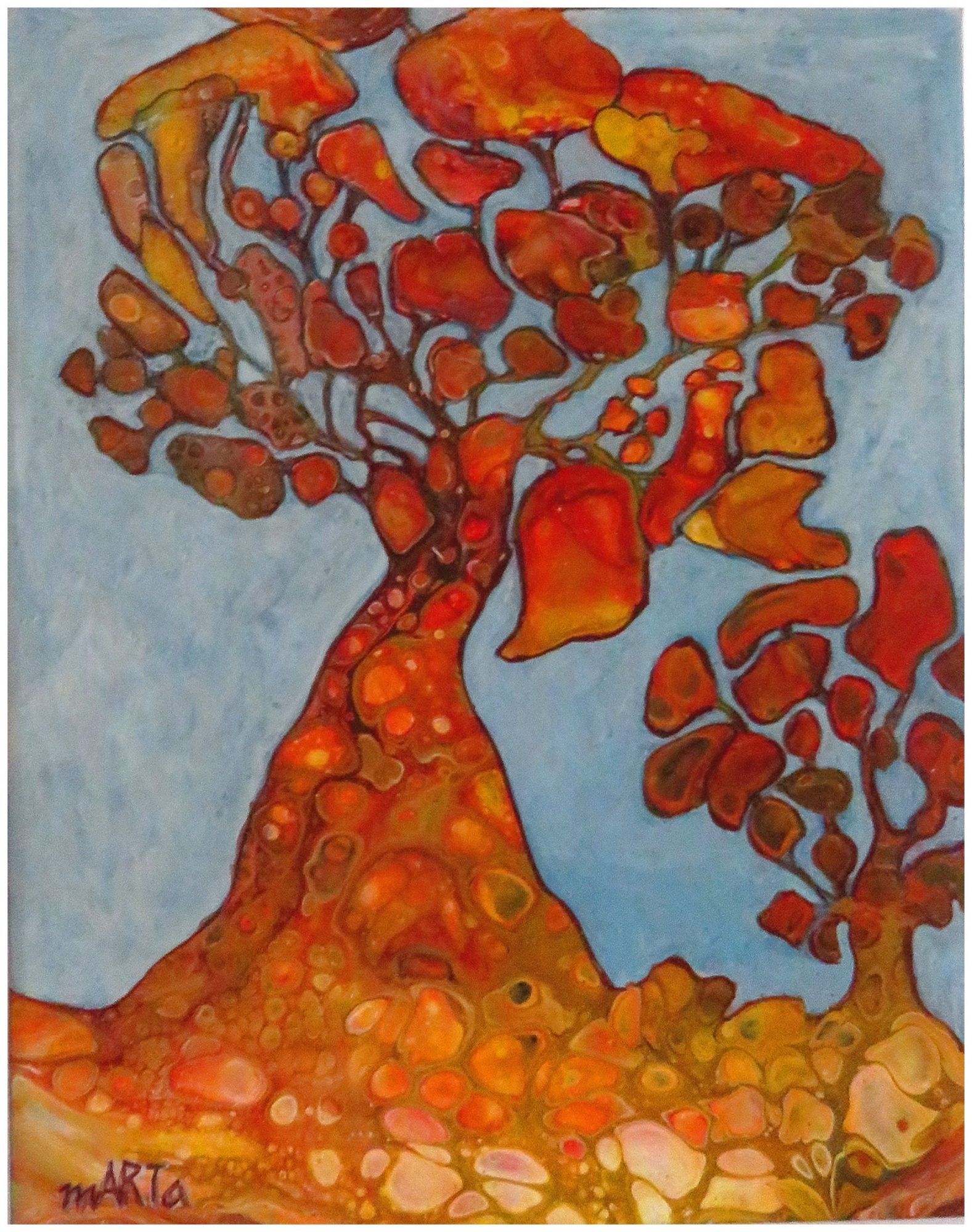 After pouring this acrylic pour in the fiery acrylic colours of yellow, orange and red, I immediately saw the Golden Tree emerging. To bring it to life, I used sky blue Global acrylic to negatively paint around the strong trunk and delicate leaves.