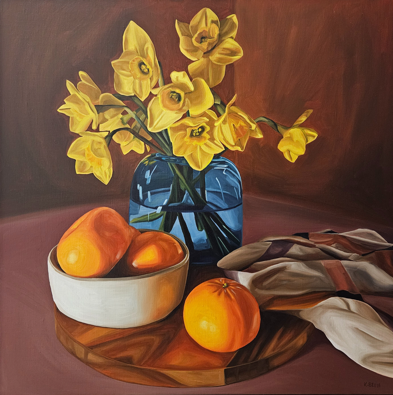 Golden Warmth by Keanna-Belle Sacilotto –This warm still life focuses on golden daffodils and zesty mandarins arranged on a wooden board, drawing the viewer toward the vase of flowers at the center of the composition. The bright yellow daffodils are set against a dark, moody backdrop, allowing their color to glow.