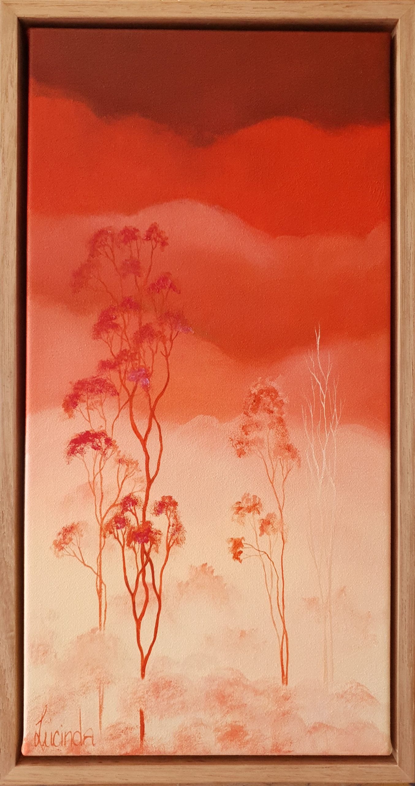 The artwork is on gallery style stretched canvas and the colour is continued round the sides, this piece is ready to hang with an Australian Oak floating frame approximately 5 cm deep.