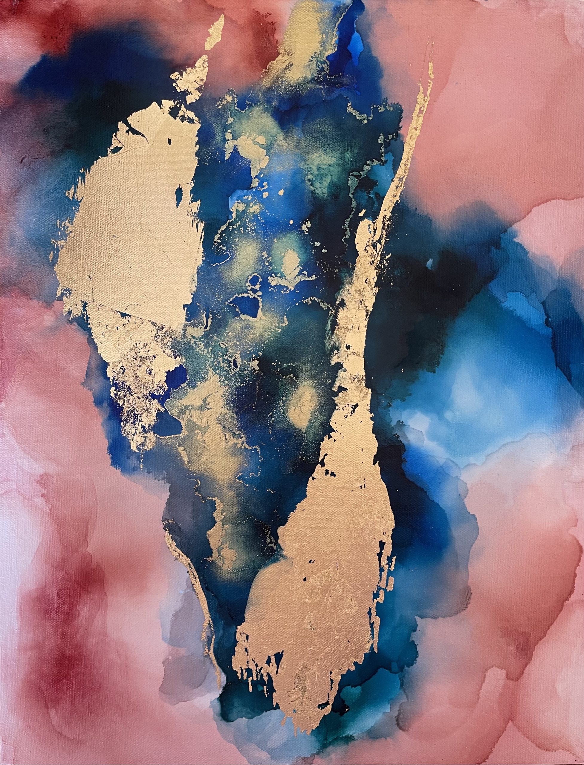 This artwork has been produced with alcohol ink and gold leaf on canvas. The rich blue and green hues are juxtaposed with a sangria earthy tone creating a sense of harmony. The addition of gold leaf alongside gold ink results in an image that looks like an aerial view of the landscape.