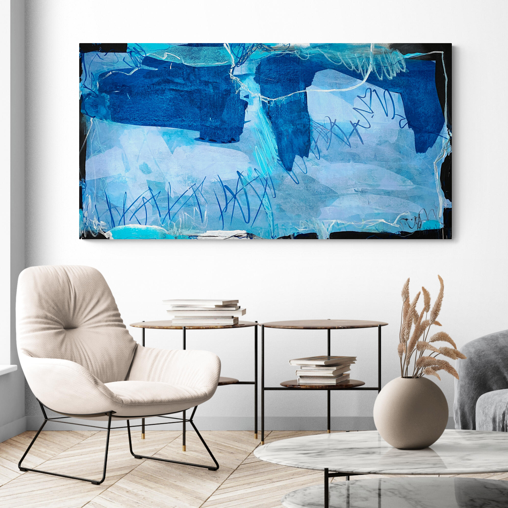 It is a beautiful statement painting perfect for any large space. Its vibrant palette of light and deep blues, grey and white combined makes the bold expressionist mark-making come alive.