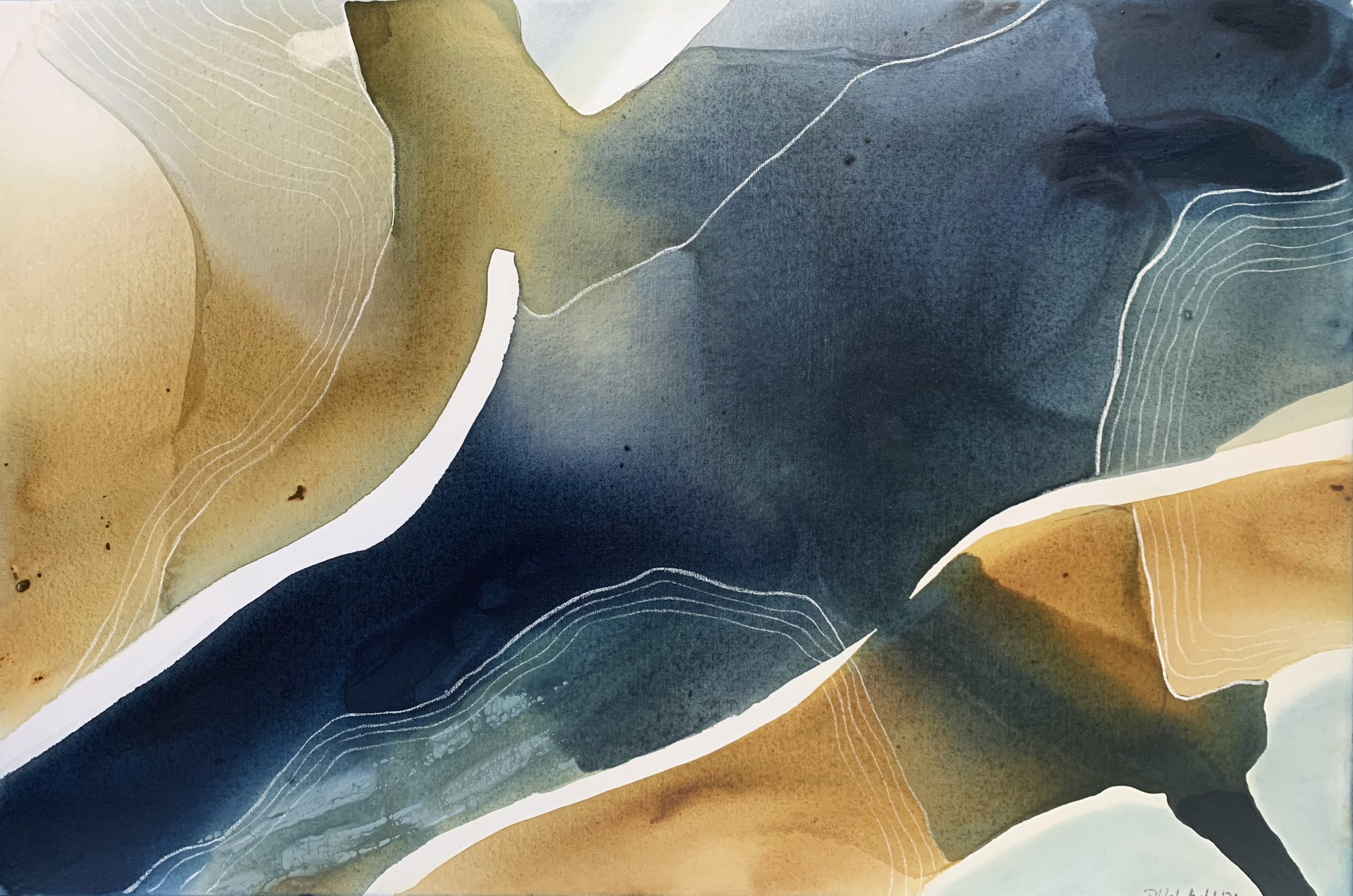Gondwana by Dinah Wakefield is inspired by the light, the colours and the natural beauty of the Noosa region of Australia. “What I love most about Noosa is the interplay of light. From the oceans to the clouds, to the river estuaries and the hinterland, this canvas unfolds before me every day and finds expression in my paintings”.