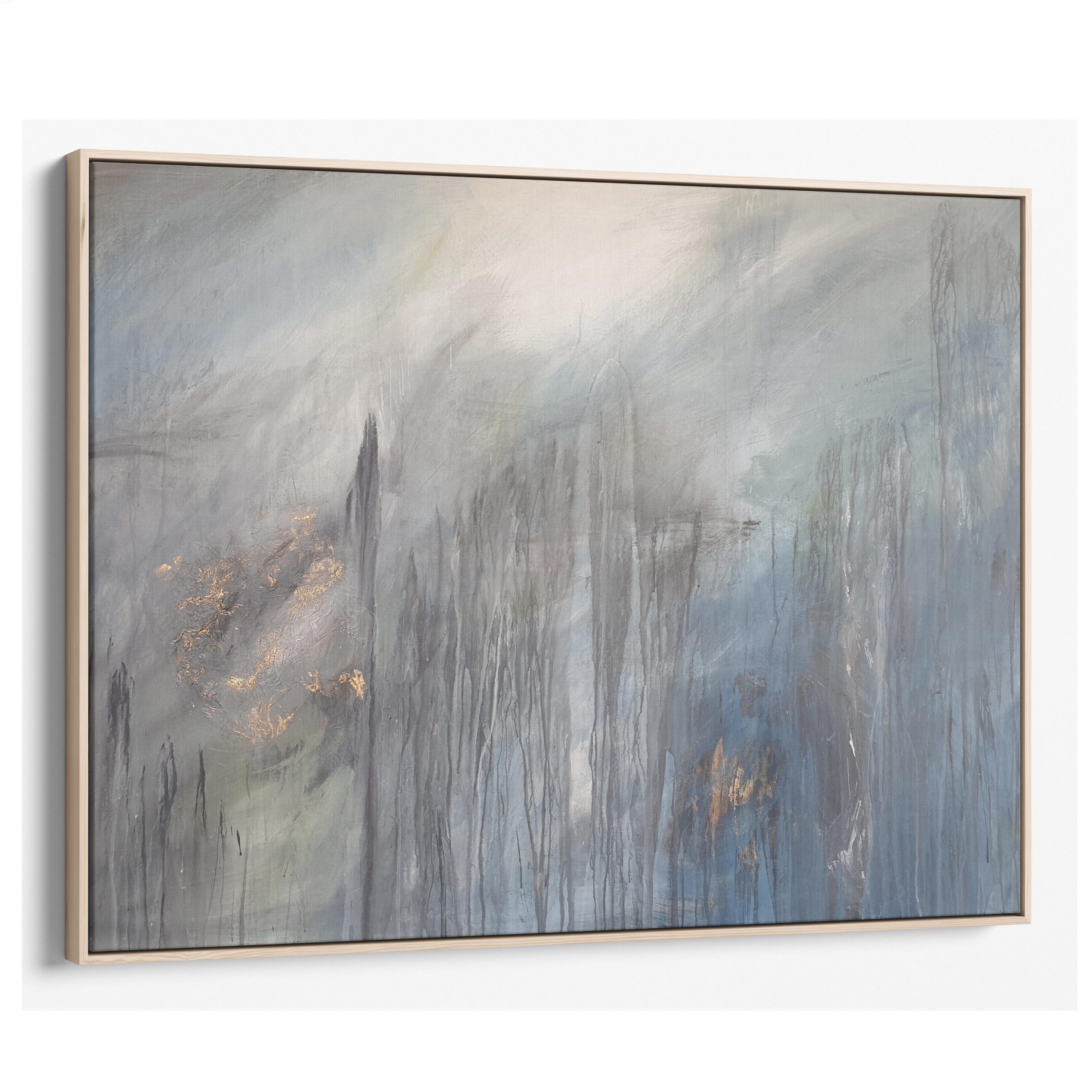 The painting does’t come with the external frame. The images attached are representations of what it could look like after being framed. No hanging wire.