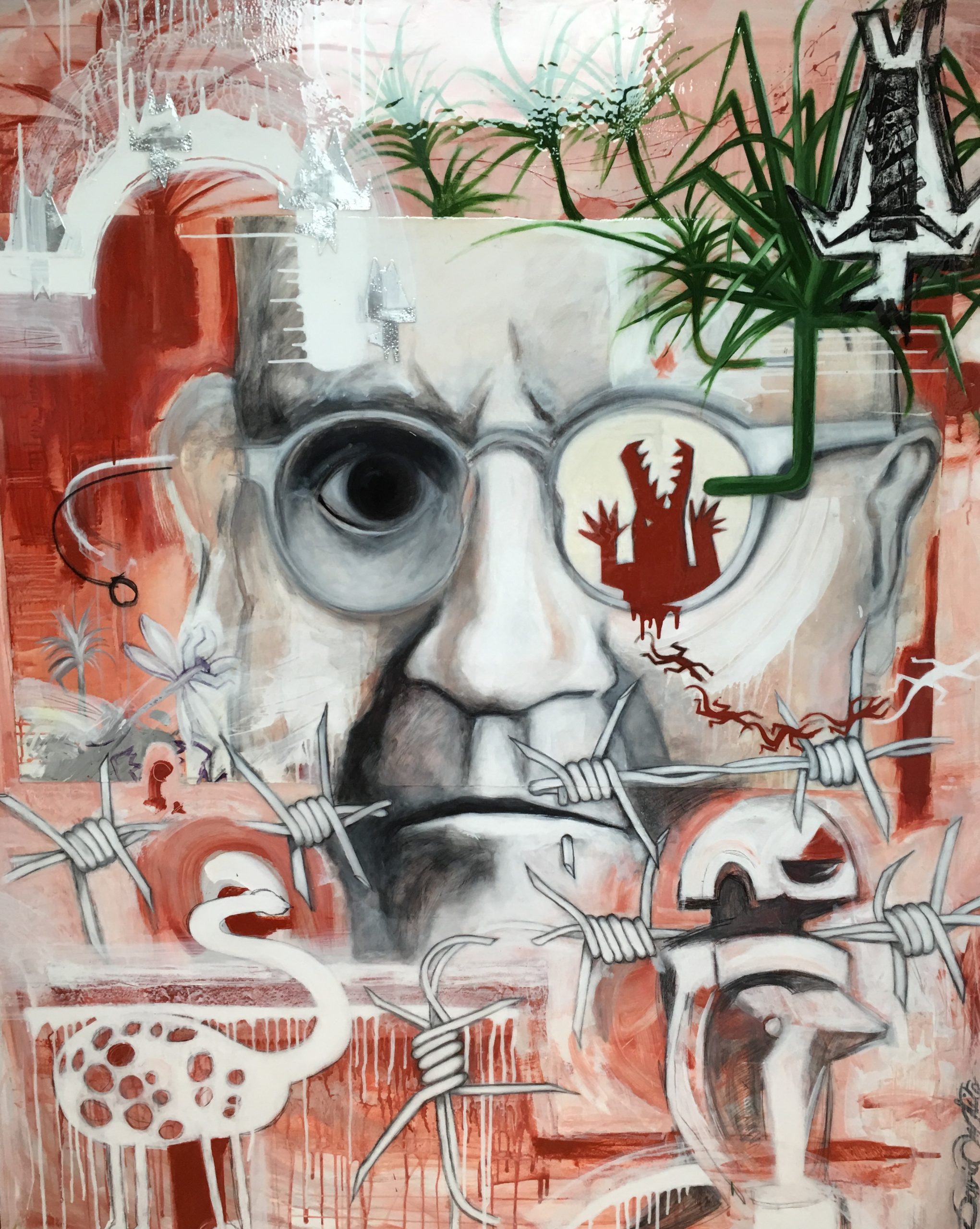 Gone Kakadu by David White – This painting has been produced on canvas & wooden panel. Acrylic, graphite and aluminium sheeting covered with resin.