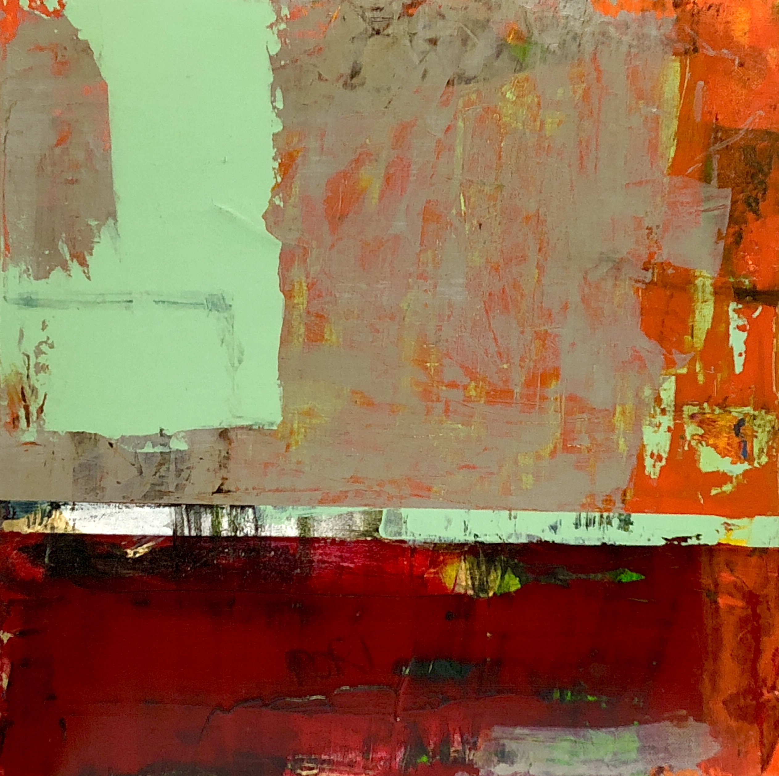 ‘Gone Travelling’ is a beautiful textured abstract painting in soft greens and dramatic reds and orange tones. This painting is made all the more intriguing by its layers of colour and free spirited evolution that would be a wonderful addition to any space with soft textured furnishings or perhaps a minimalist environment where you want an artwork that will ‘POP.’