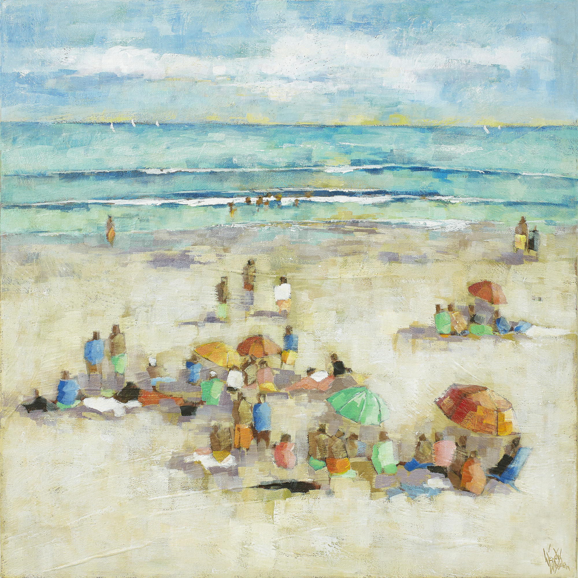 An expressionistic artwork of a beach, using a soft pastel palette that evokes a sense of summer.
