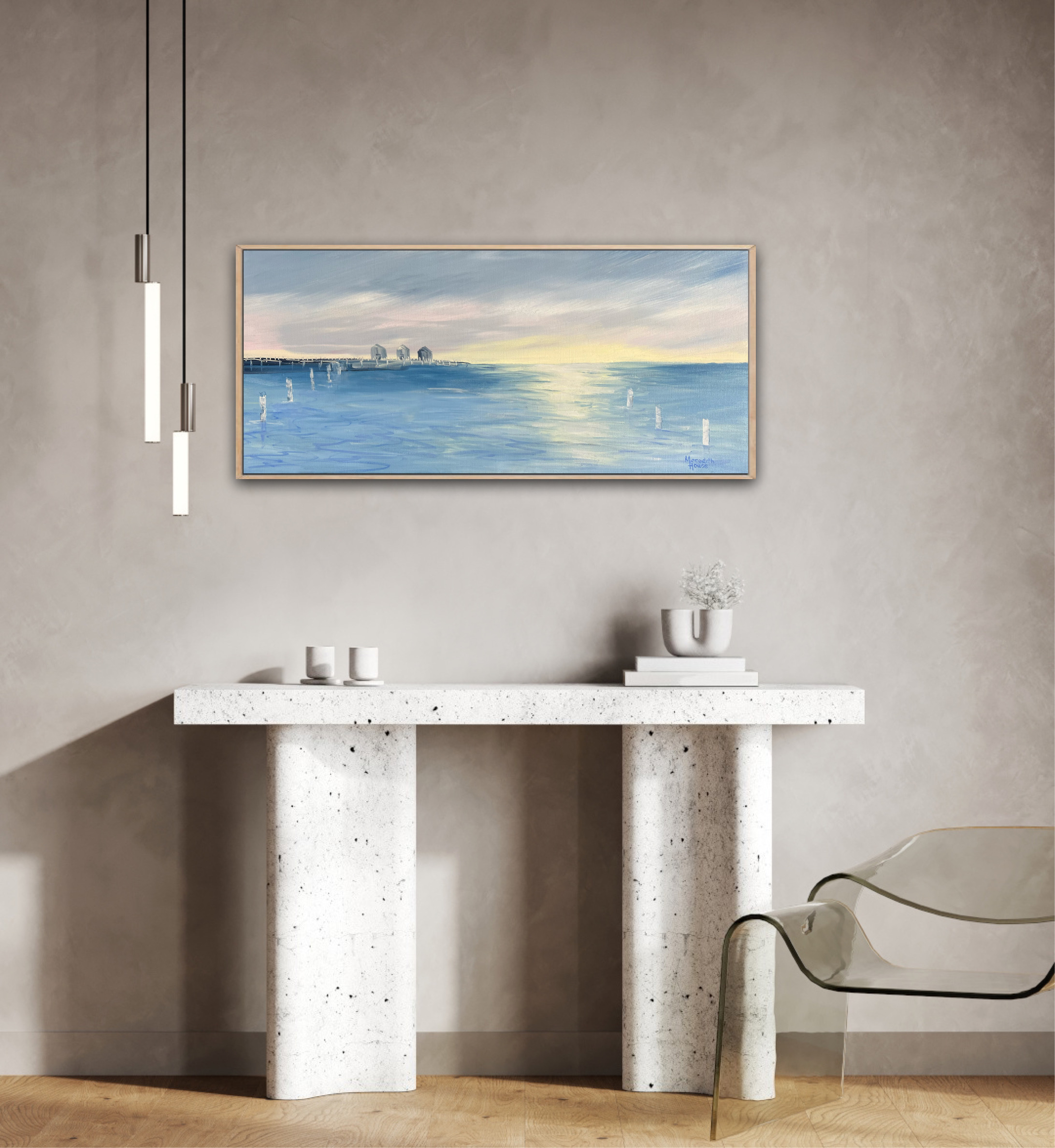 ‘Good Morning’ by Meredith Howse is a serene seascape captured in tonal blues, evoking the tranquility of early morning. In the distance, a pier stretches into the calm water.
