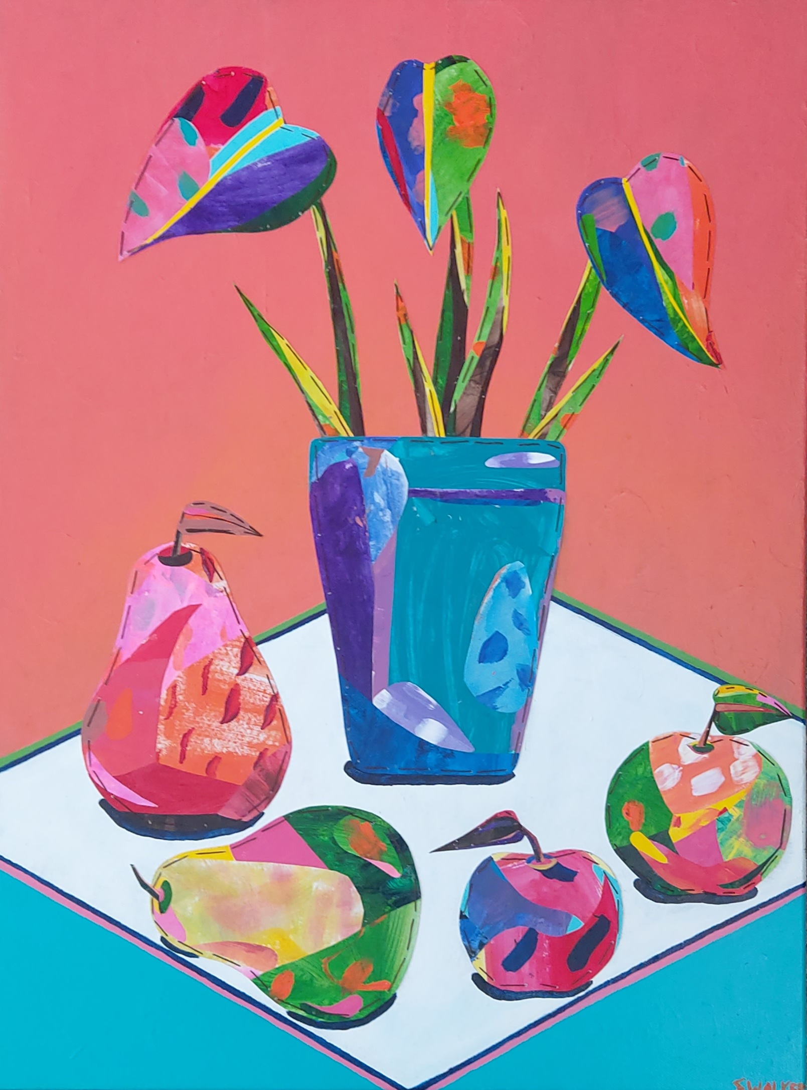 This piece is vibrant, happy, joyful, and reminiscent of one of those mornings where everything is beautiful, the day is alive with possibility, and all is right with the world. Those days don’t happen often enough, so I wanted to capture that feeling for the days when everything is awful instead, so there’s something fun to look at. This piece is composed of paint, collage on watercolourp aper, and stitching, and a whole lot of life.