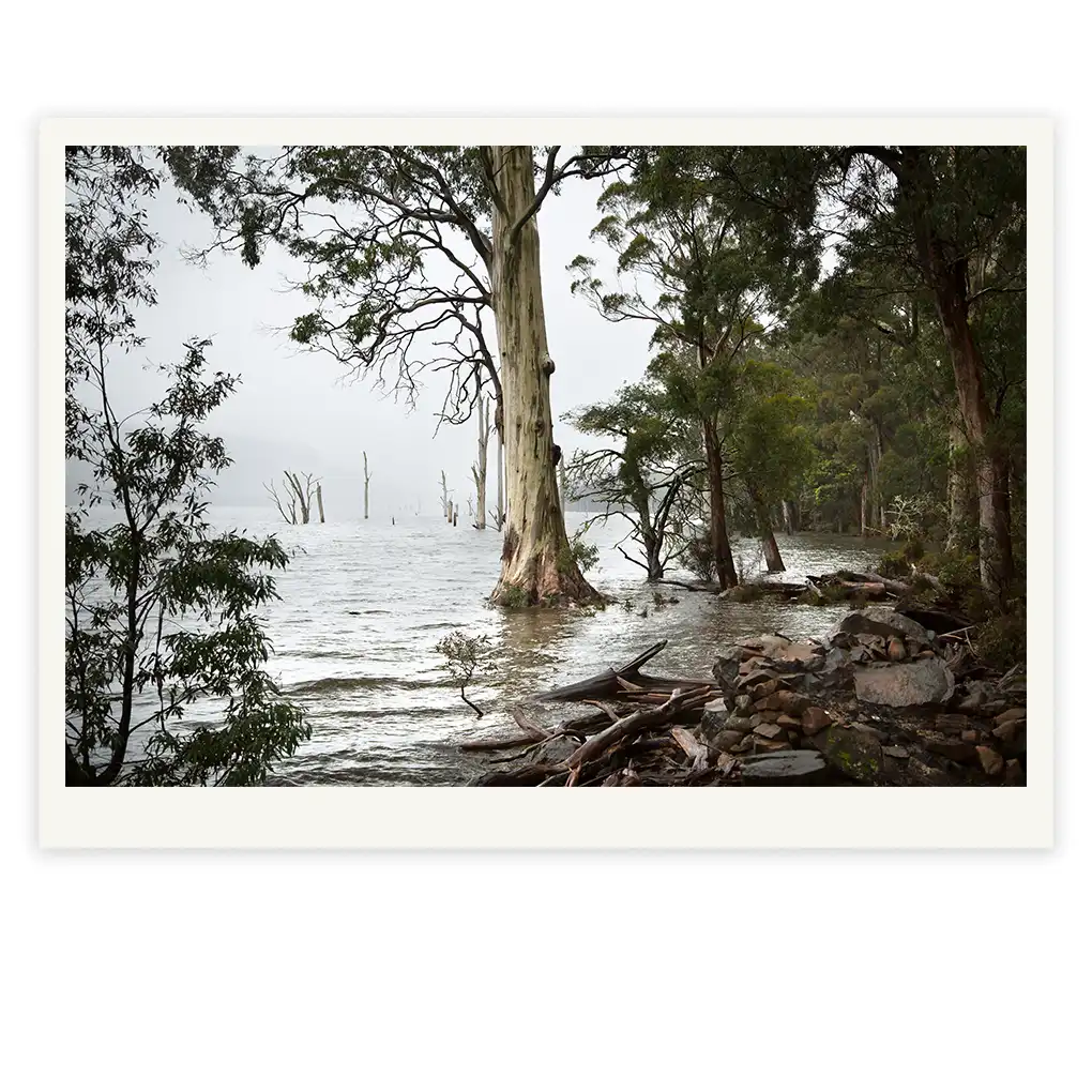A striking fine art landscape capturing Tasmania’s Mersey River in flood. Stands of trees flank the scene, a fine eucalyptus, trunk partly submerged rises from the waters, while a circle of deadwood form a pen on the horizon beneath an overcast sky. Inspired by the style of Australian landscape painters, a land in flux.
