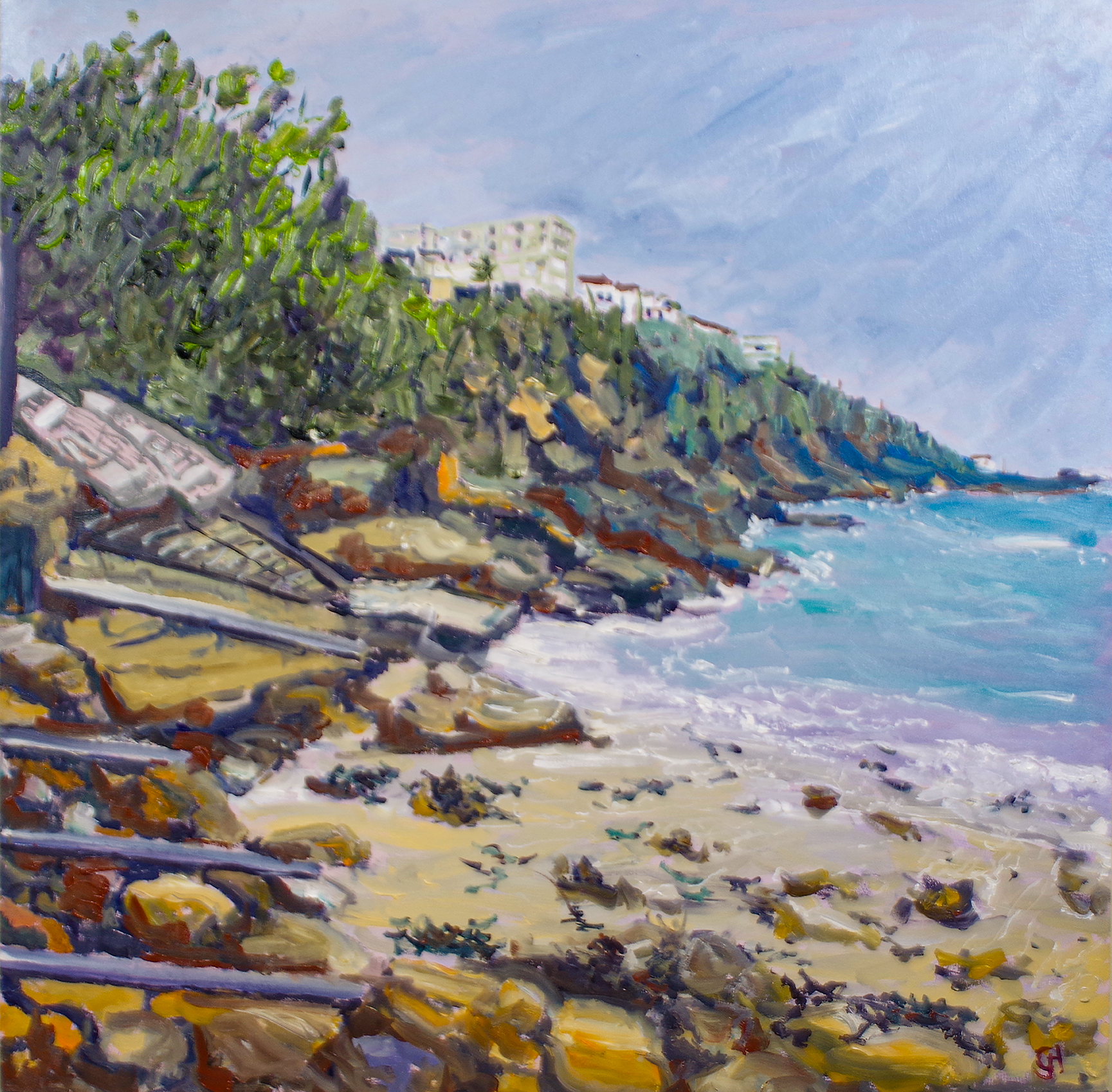 My original oil painting is looking towards the northern shore from where the small tinnie’s are pulled up and stored out of the waves.