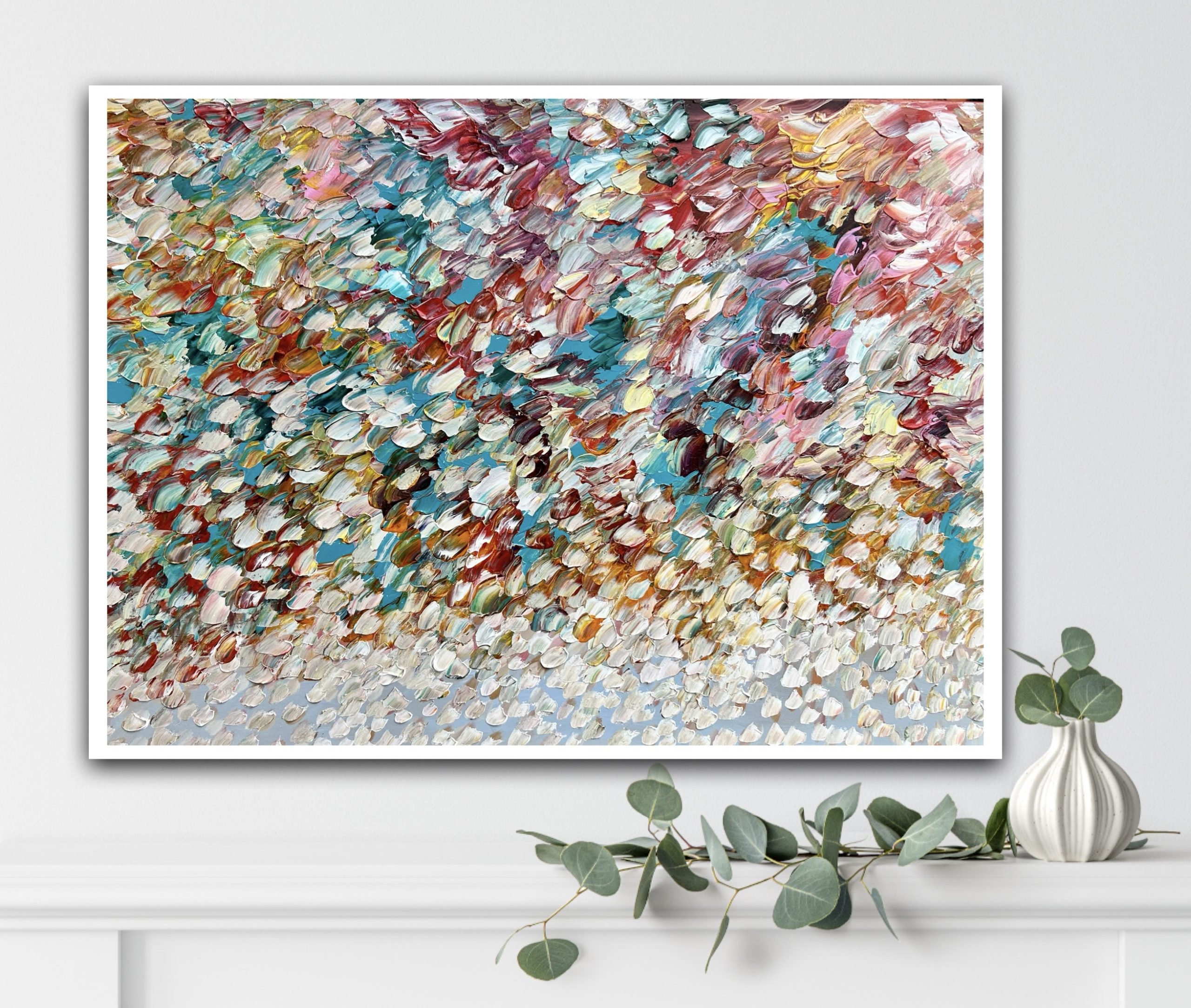 Gorgeous Beauty by Theo Papathomas a painting with lots of layers of beautiful warm and cool colours of petals weeping over the field. The landscape becomes a bouquet of petals dancing over the land. I tried to create this beautiful composition of playful colours of the landscape of flowers and petals making a beautiful field of memories . Capturing the beautiful colours of the petals, like musical notes dancing over the landscape, painted in acrylics with a pallet knife. The field comes to life with the sounds of the petals creating movement and rhythms. Painted with a pallet knife makes the painting full of energy with lots of acrylic paint creating so much texture. The painting does not come with an external frame.The painting is signed and dated 2023 at the back and comes with a certificate of Authenticity.