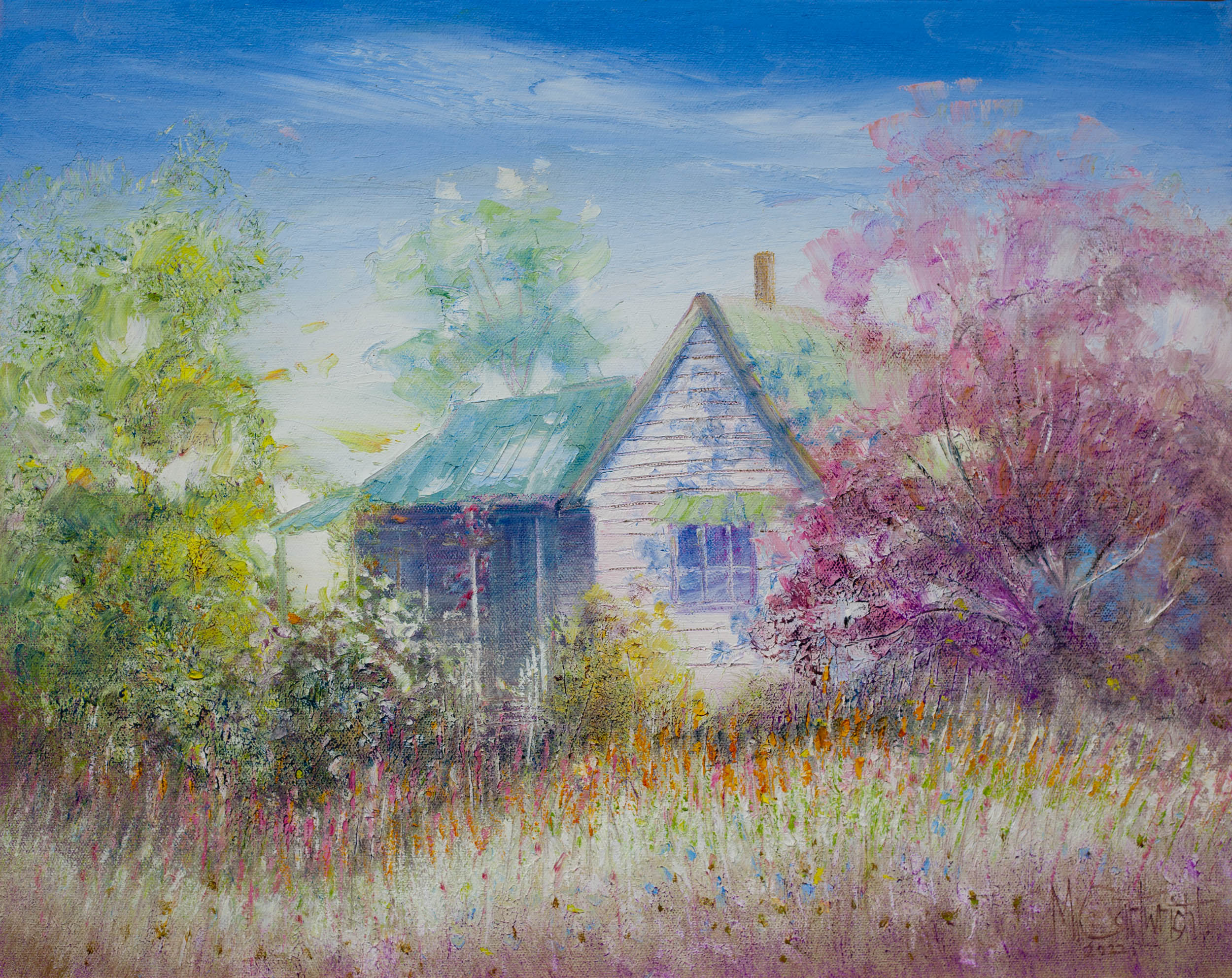 A charming old country home is surrounded by a gorgeous garden of native plants. The season is Spring and the flowers are in full bloom adding color and beauty to the subject. This beautiful old house is located in Denmark, South Western Australia. A textured oil painting spontaneously rendered using a combination of brush and palette knife.